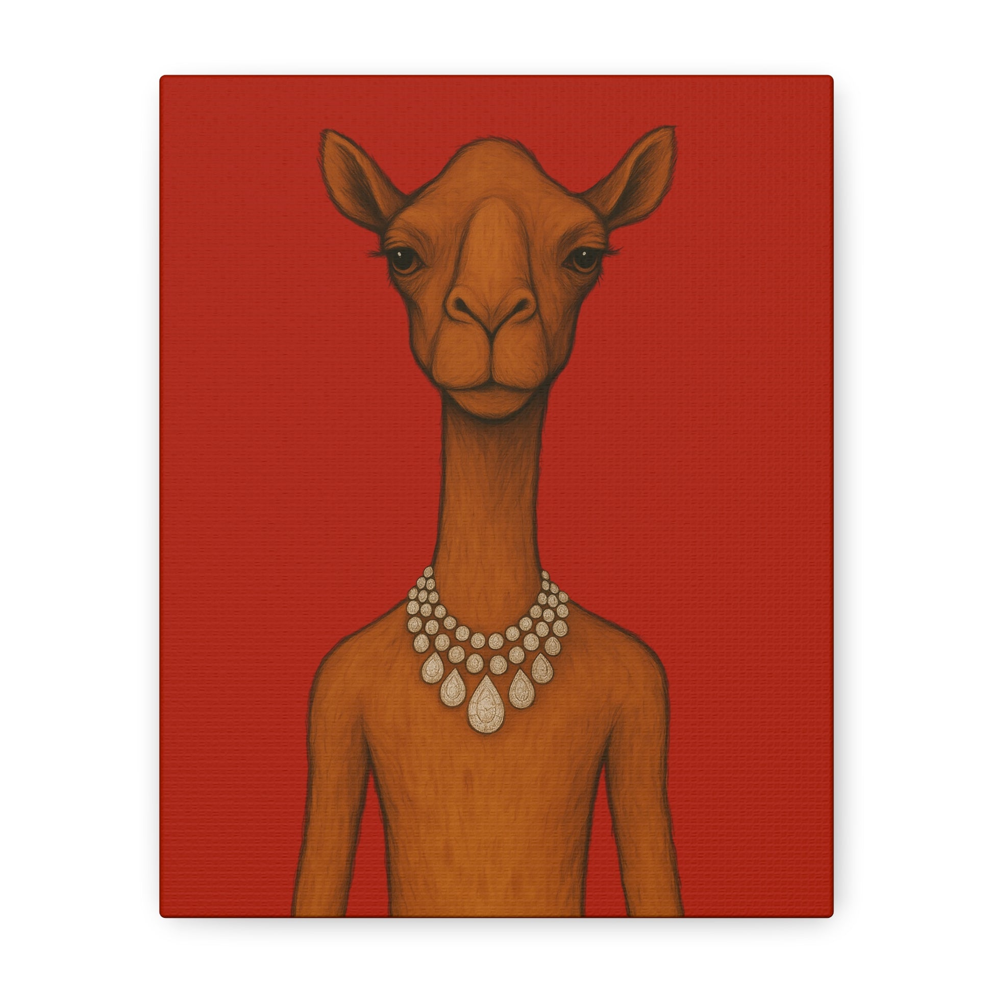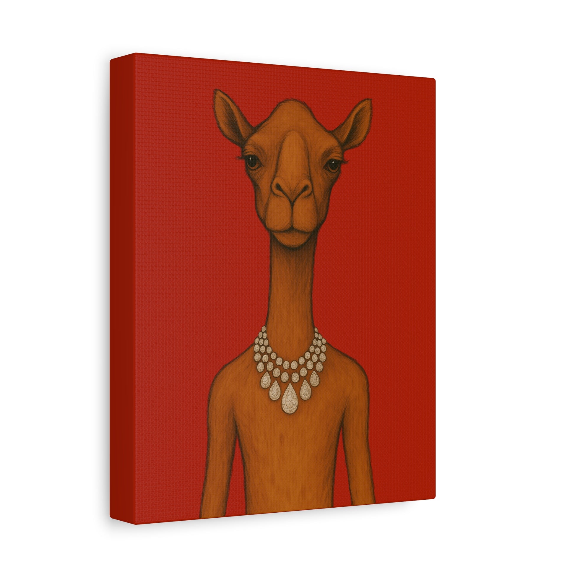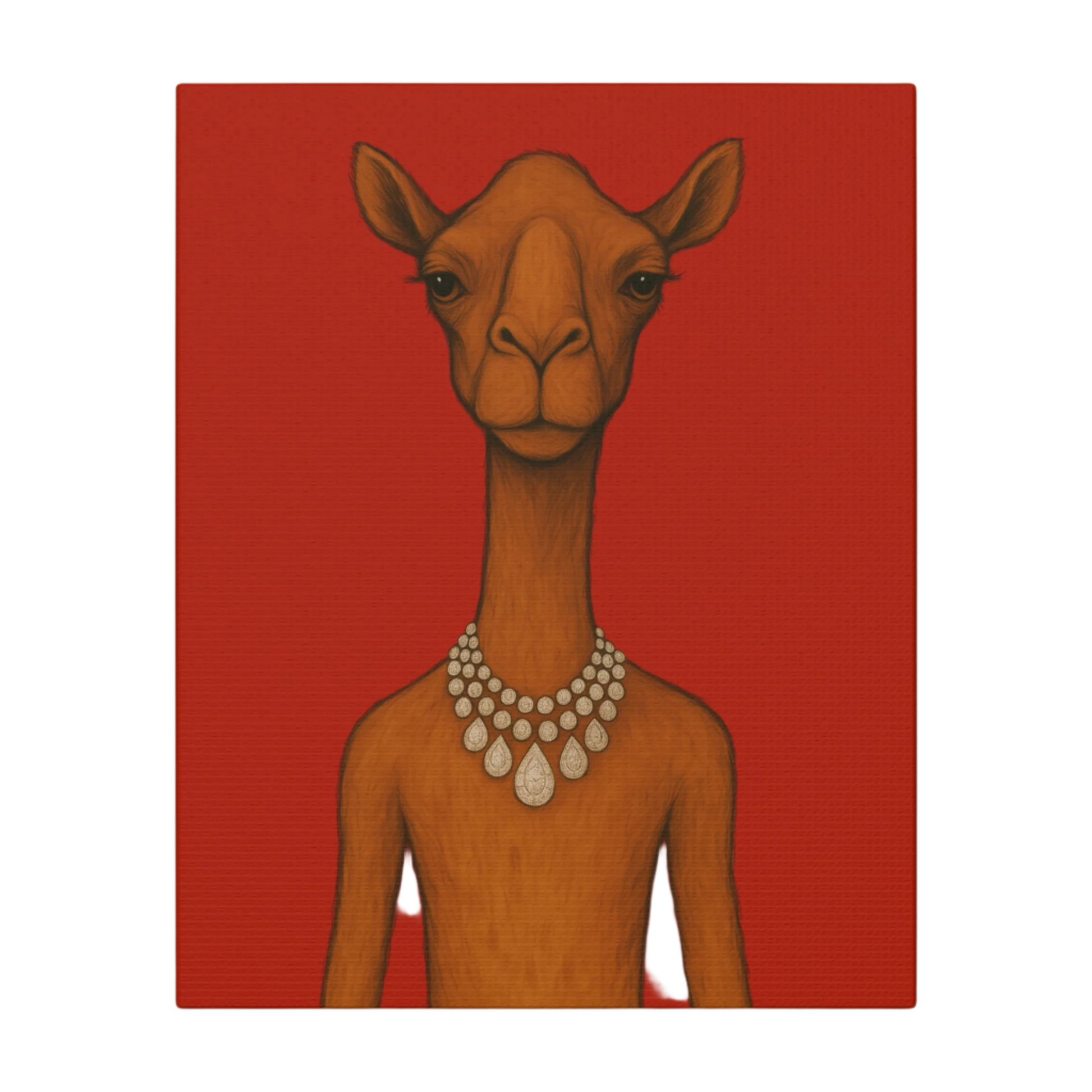 This tension between desert resilience and ornamental opulence invites reflection on wealth, survival, and the artifice of status. In measured, linear strokes, the camel’s enduring essence holds balance with the necklace’s deliberate extravagance.