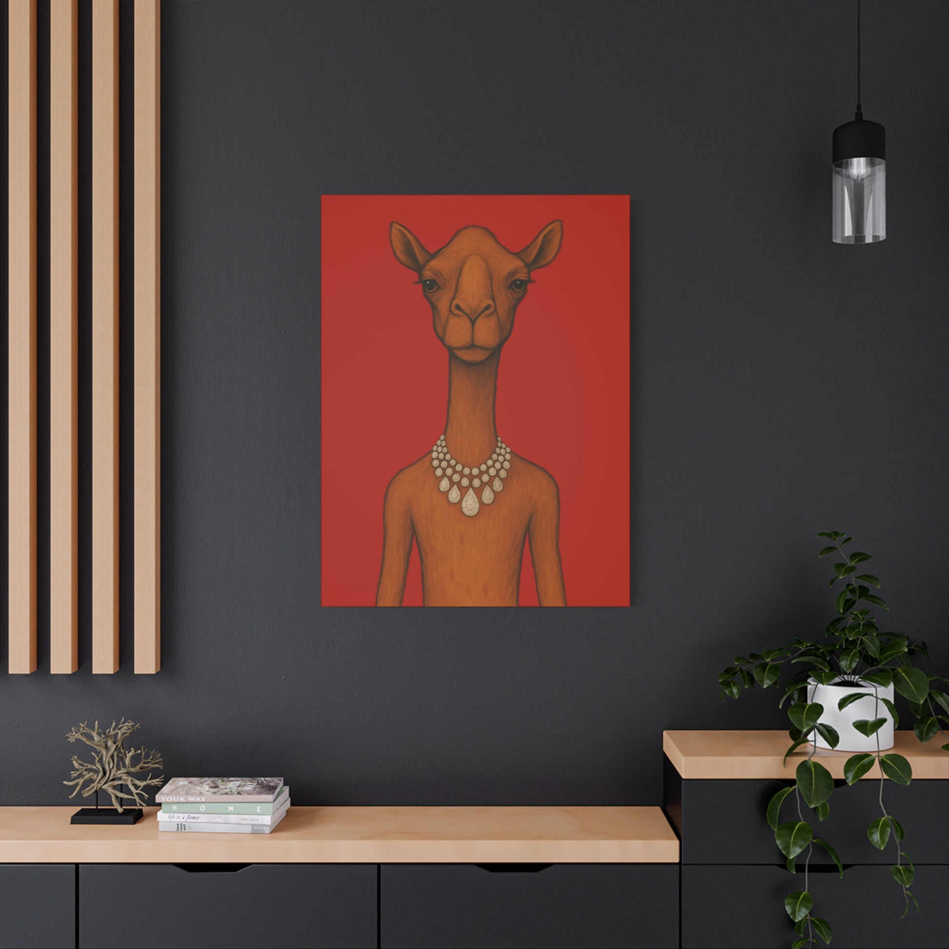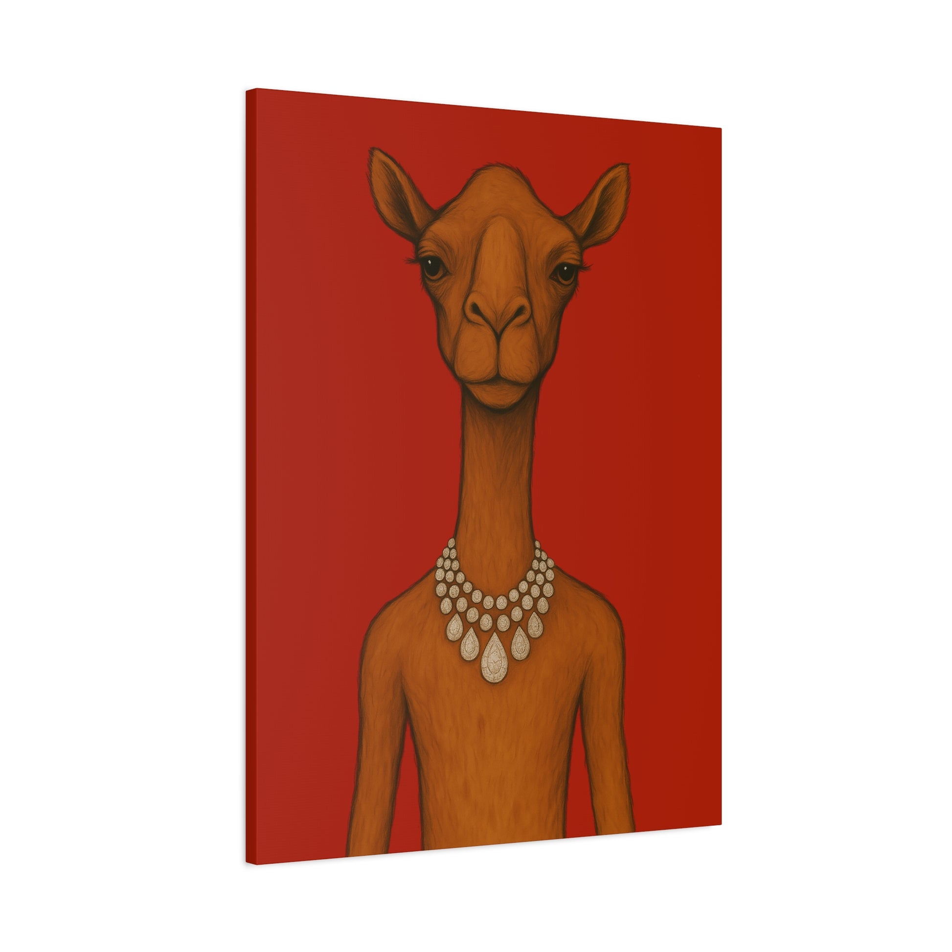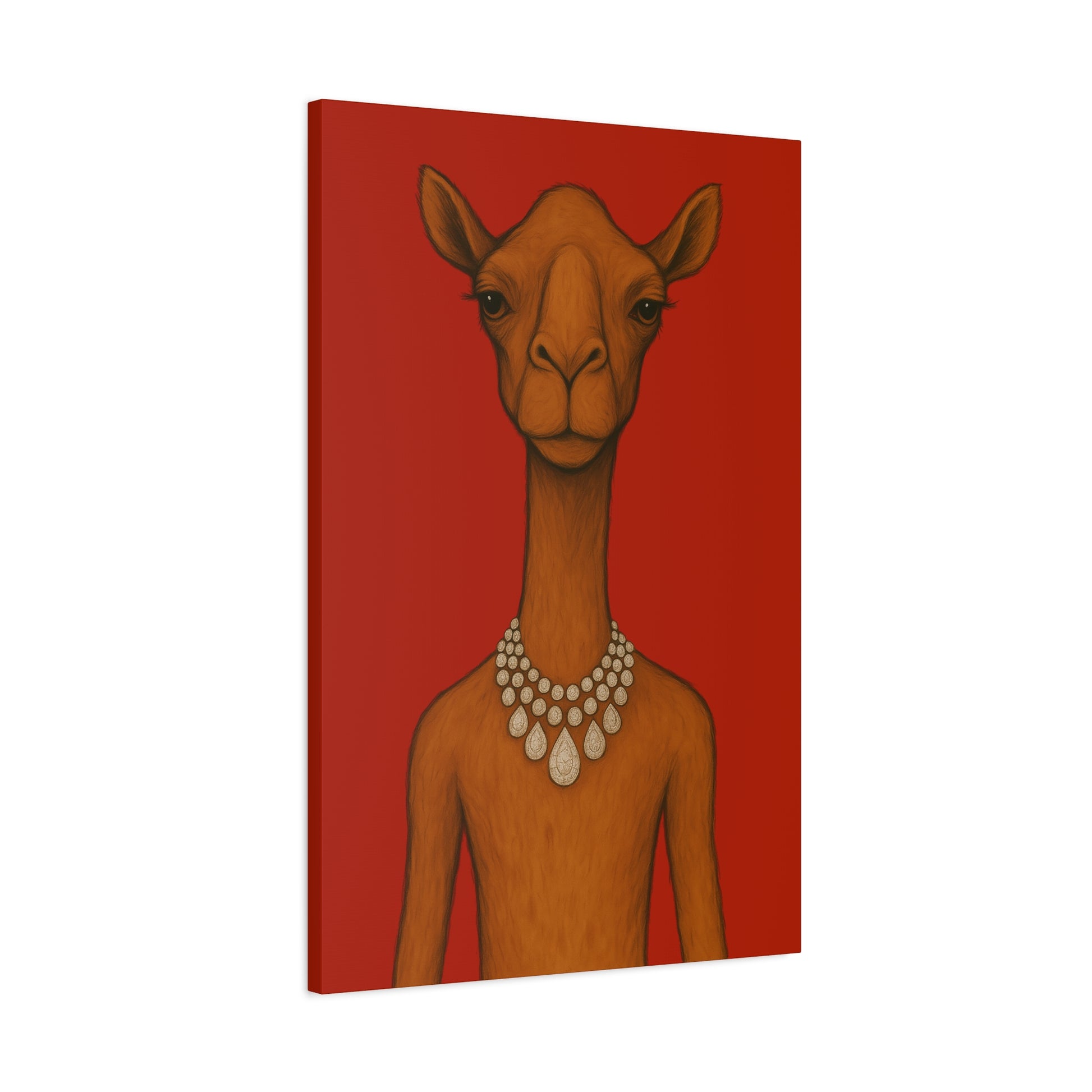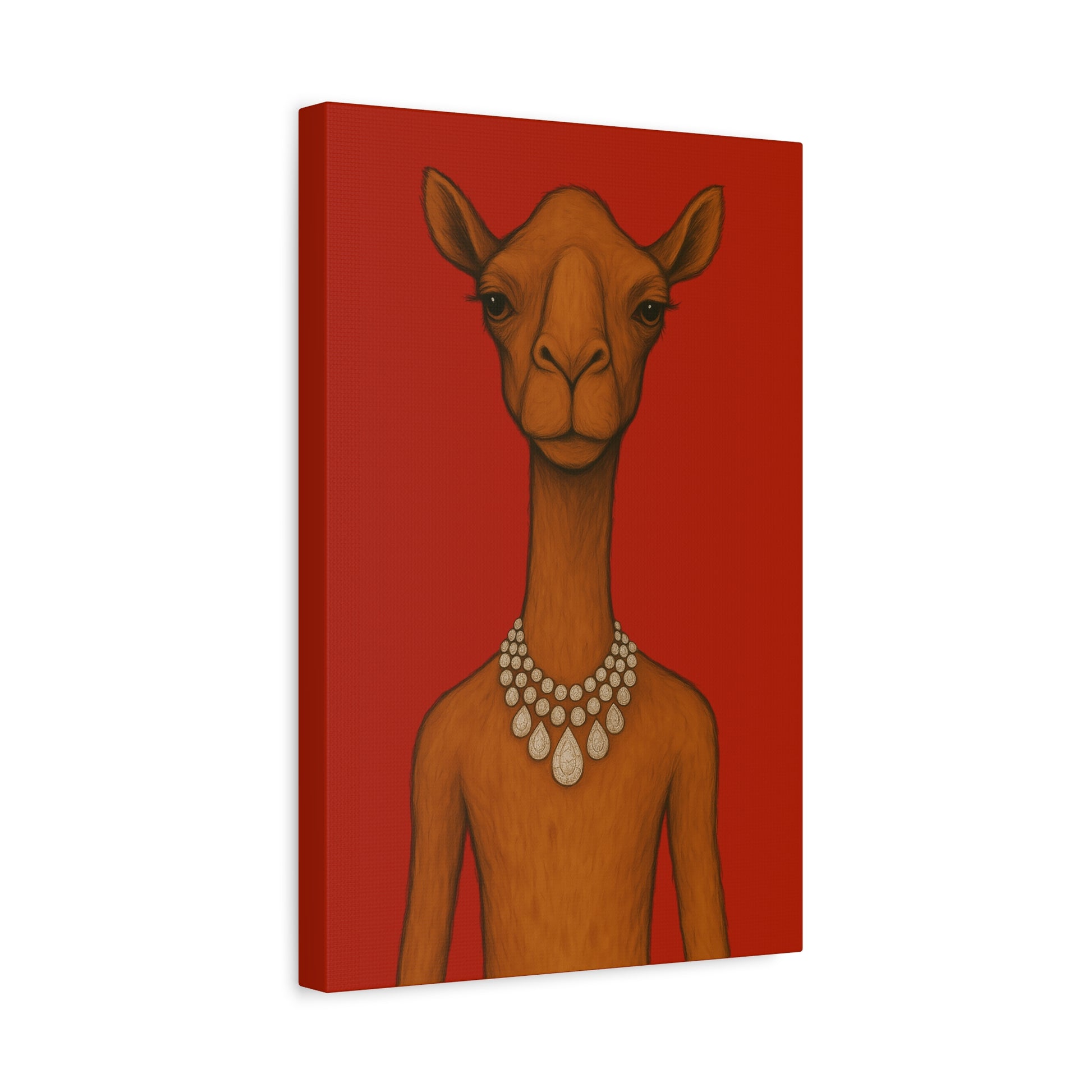This tension between desert resilience and ornamental opulence invites reflection on wealth, survival, and the artifice of status. In measured, linear strokes, the camel’s enduring essence holds balance with the necklace’s deliberate extravagance.