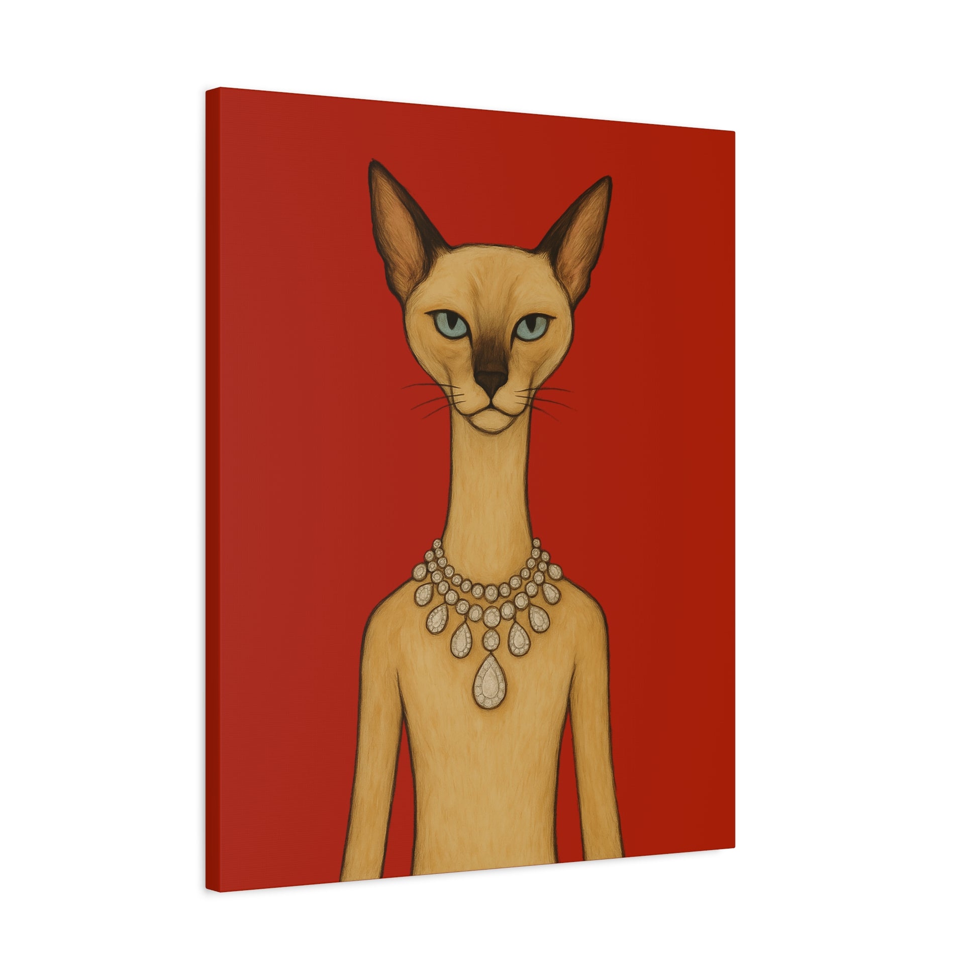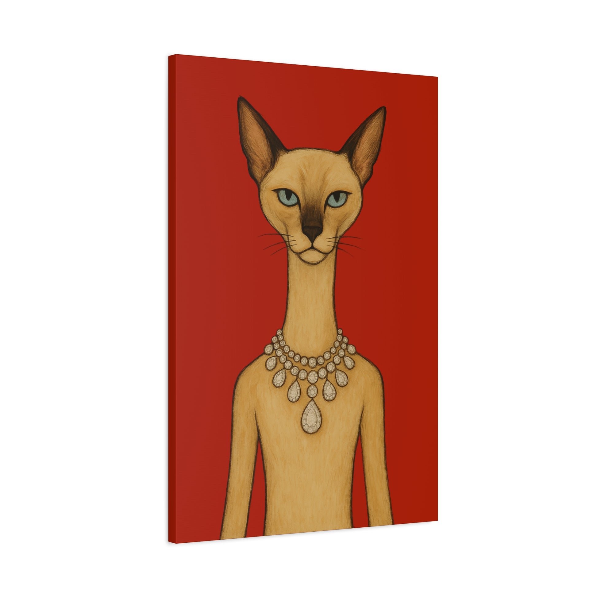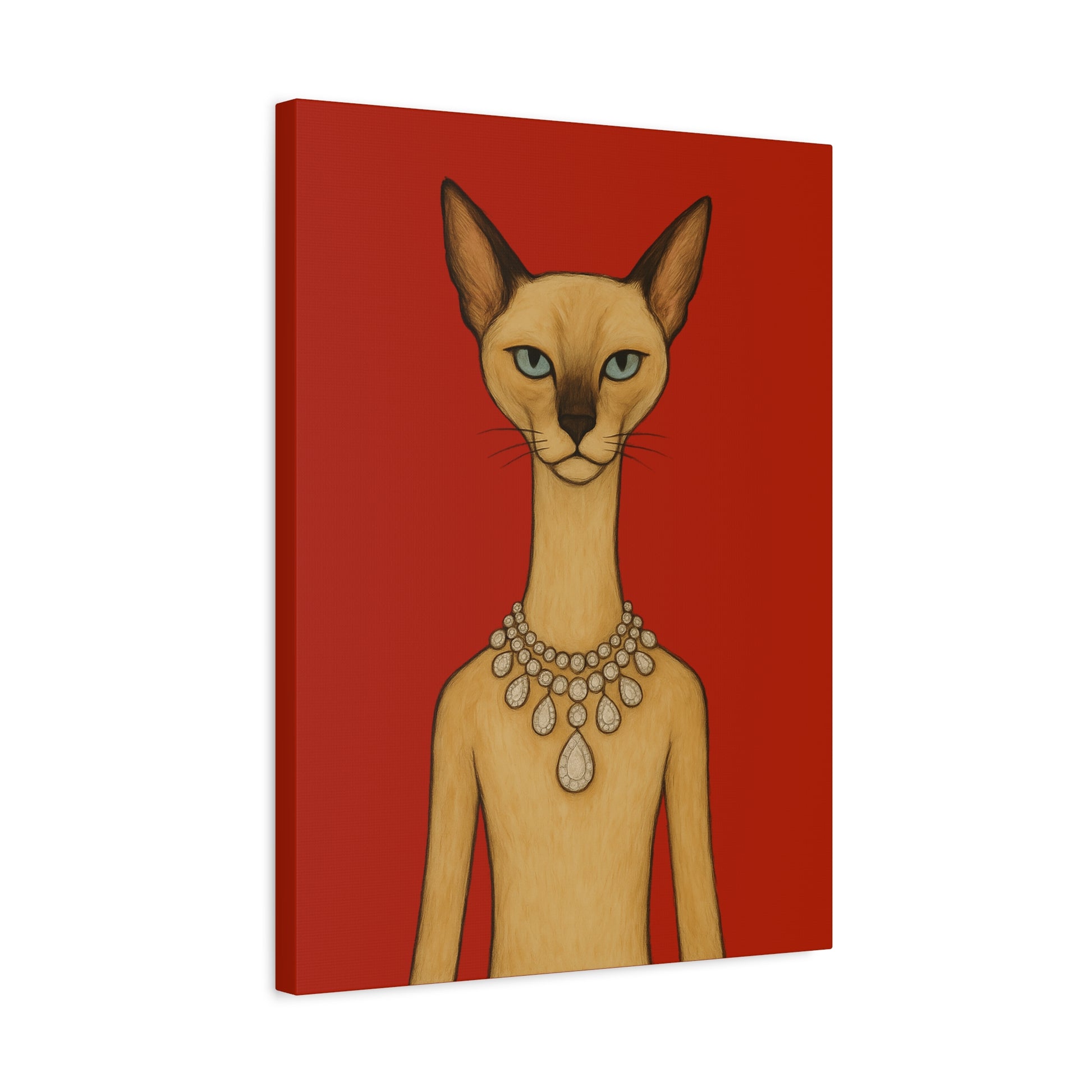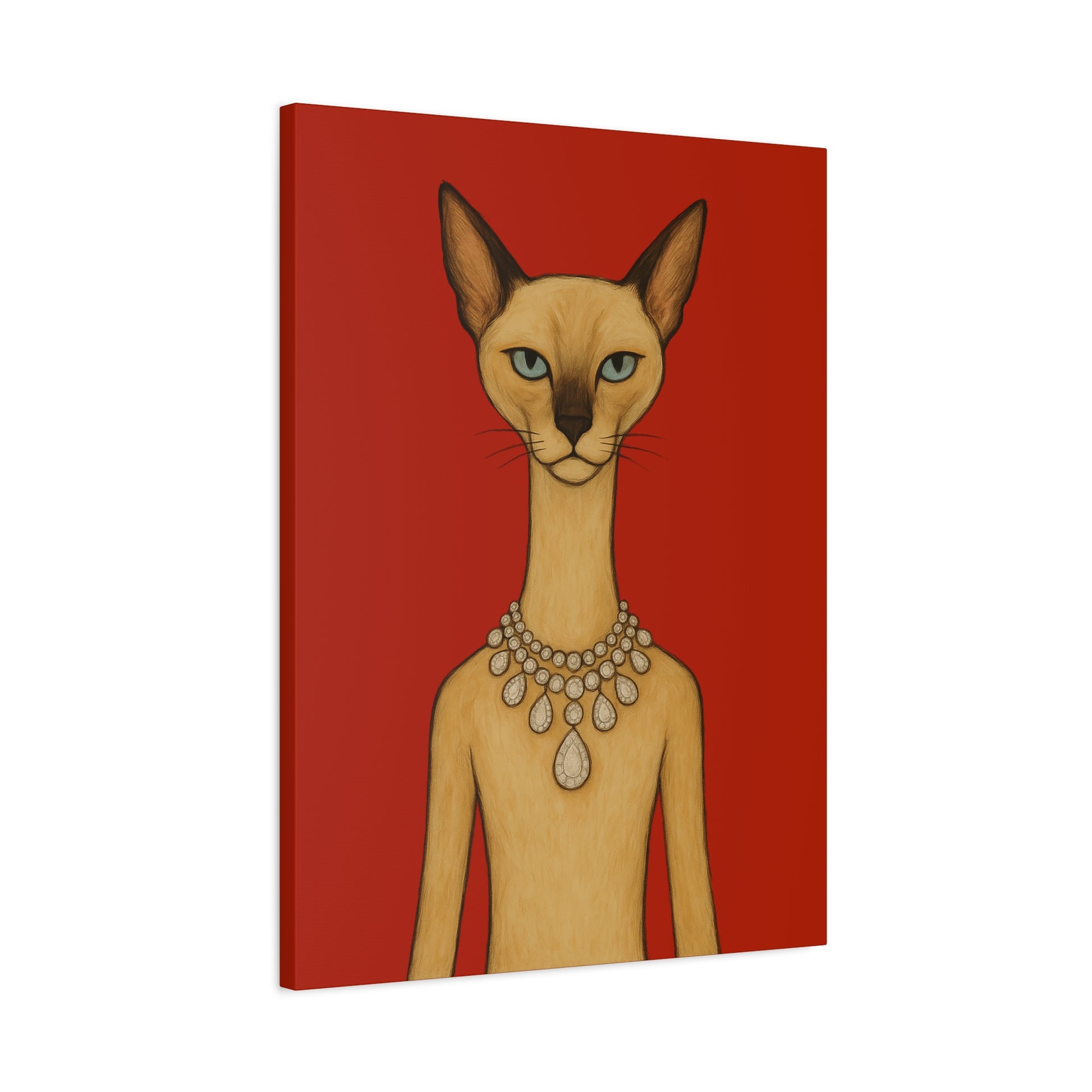Against a crimson background, a poised feline holds the viewer’s gaze with graceful authority. Its elegant neck is adorned by a luminous diamond necklace, casting serene reflections that contrast with the cat’s innate poise and independence. Its cool, thoughtful gaze engages with gentle irony, contemplating humanity’s pursuit of beauty. The artwork contrasts natural refinement with luxury, exploring themes of independence, elegance, and imposed beauty.