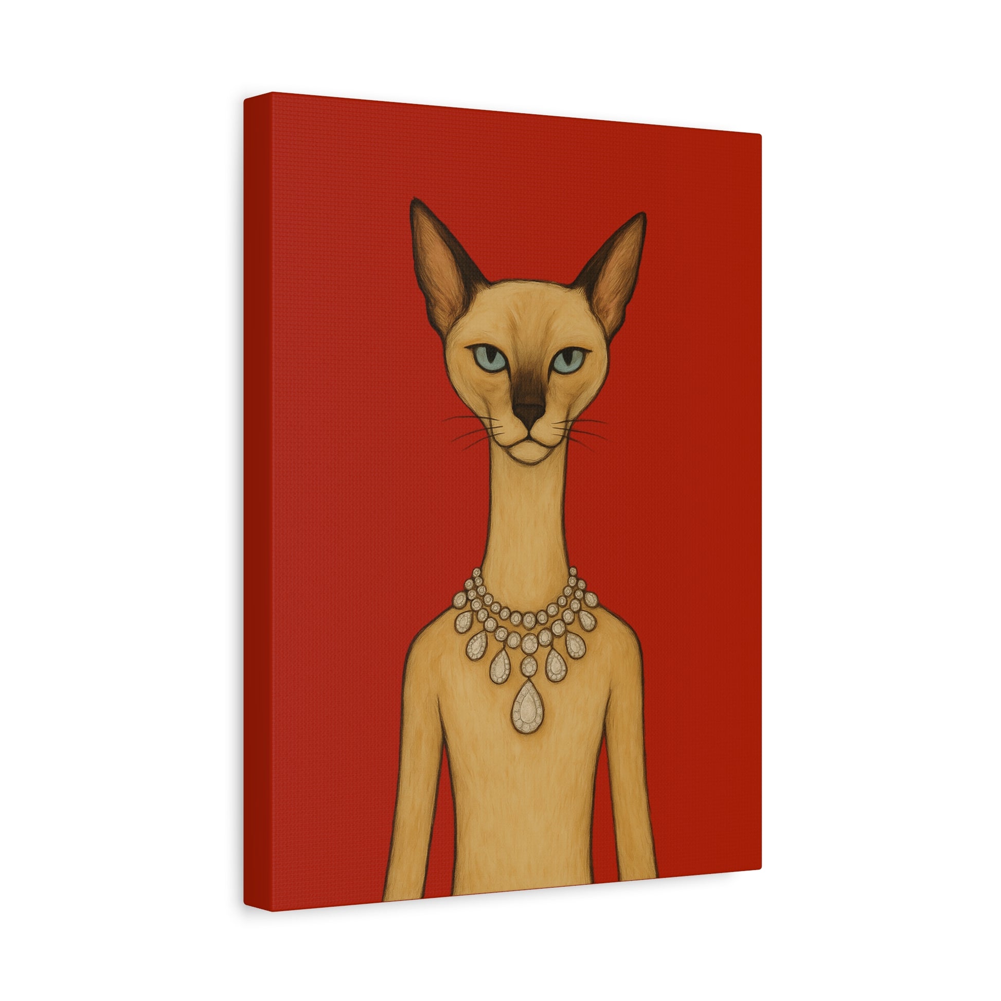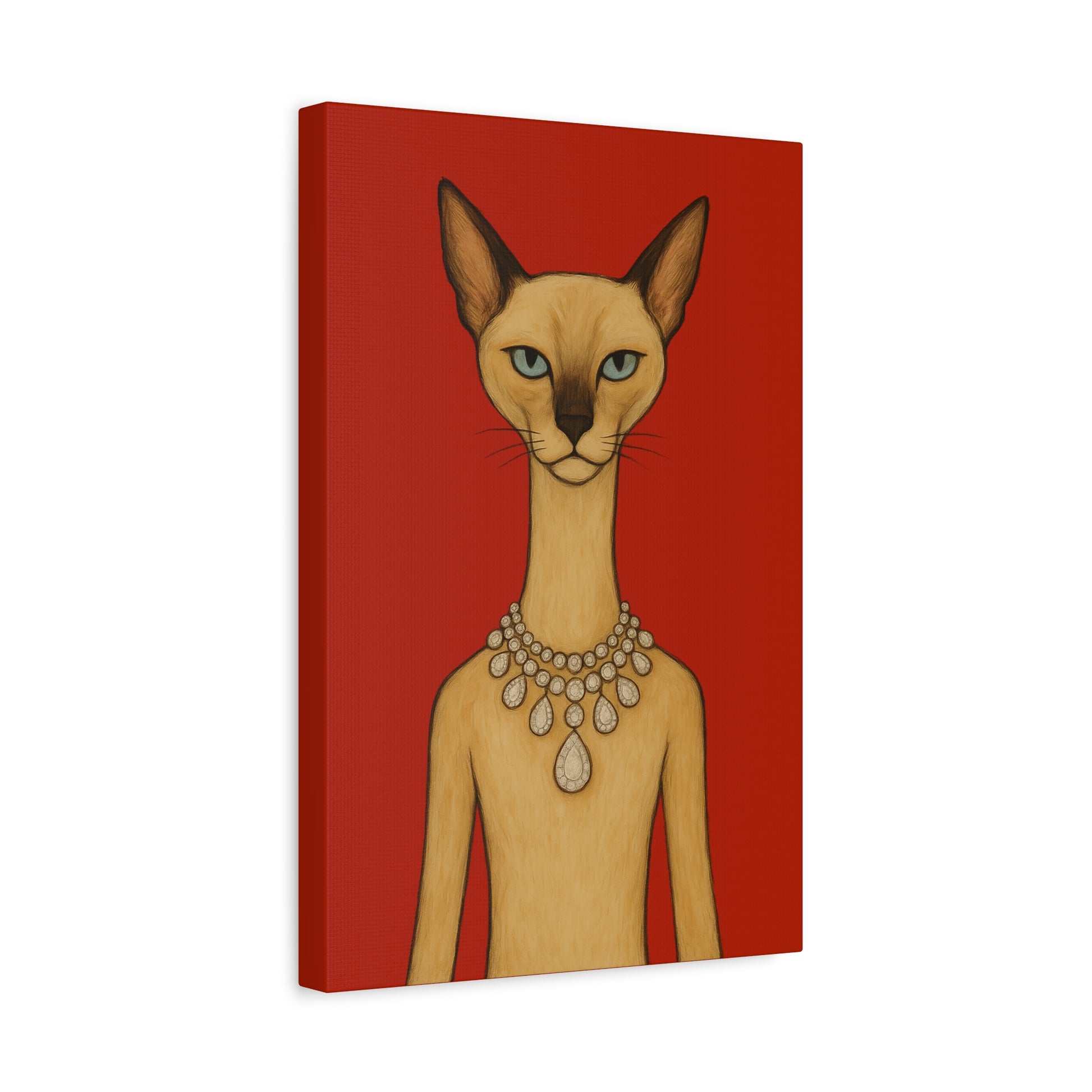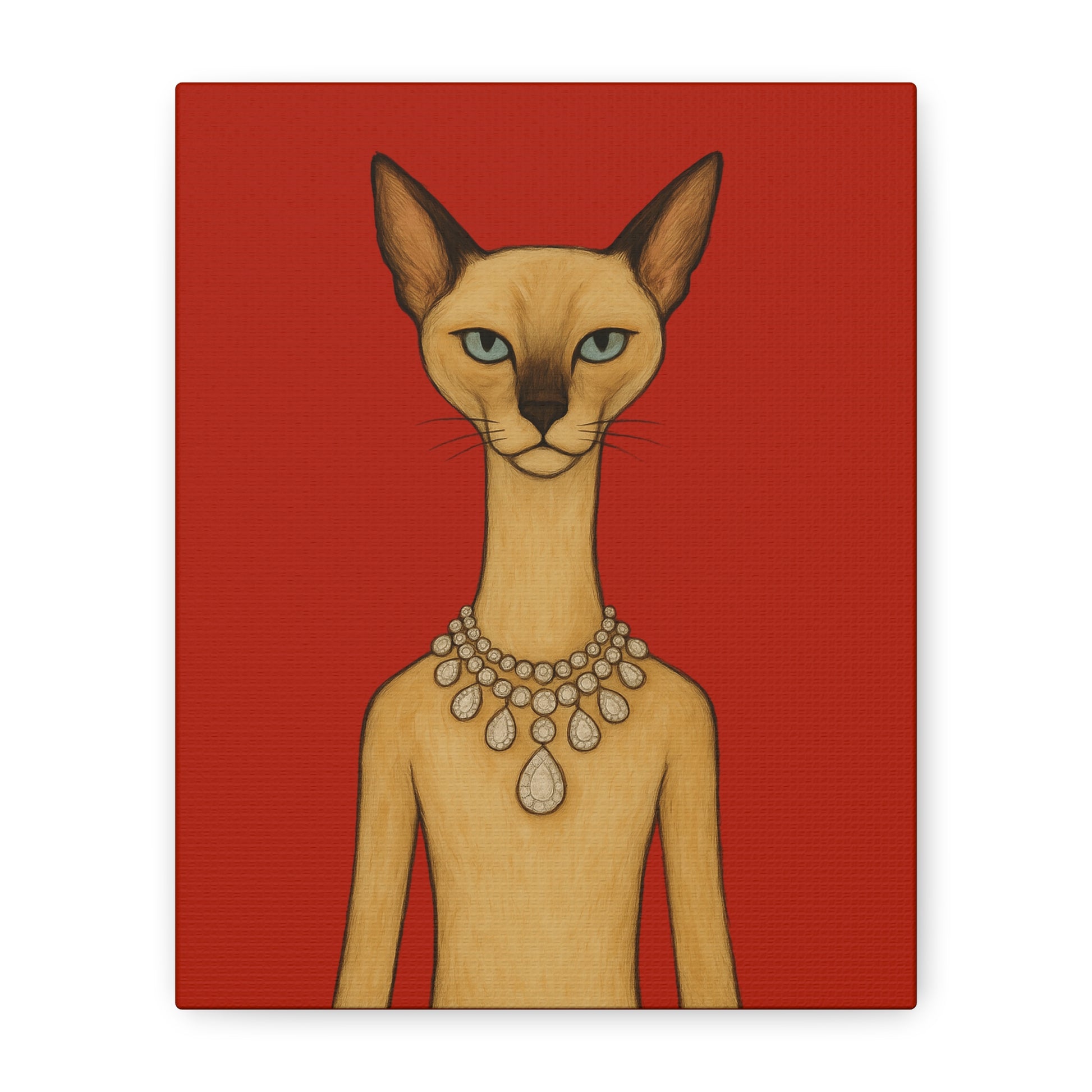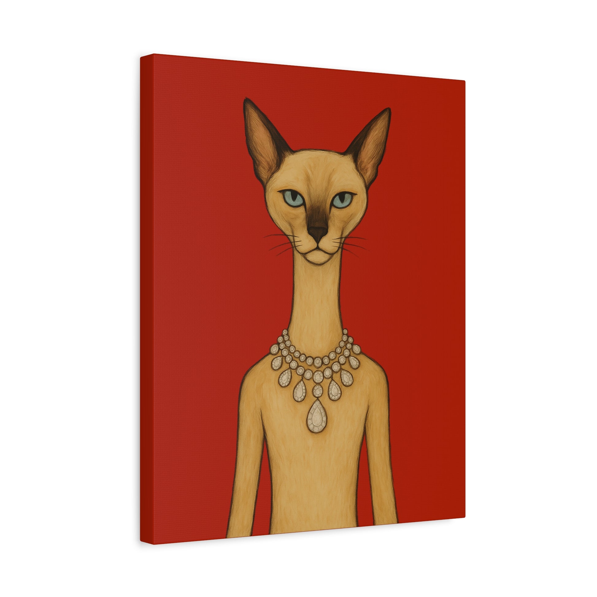 Against a crimson background, a poised feline holds the viewer’s gaze with graceful authority. Its elegant neck is adorned by a luminous diamond necklace, casting serene reflections that contrast with the cat’s innate poise and independence. Its cool, thoughtful gaze engages with gentle irony, contemplating humanity’s pursuit of beauty. The artwork contrasts natural refinement with luxury, exploring themes of independence, elegance, and imposed beauty.