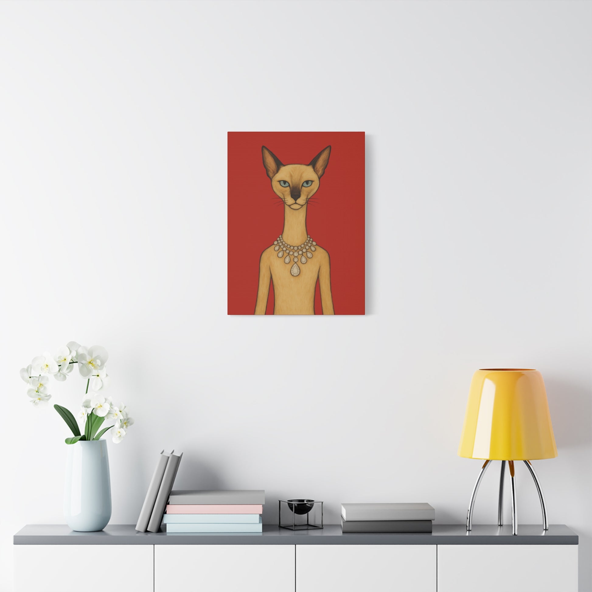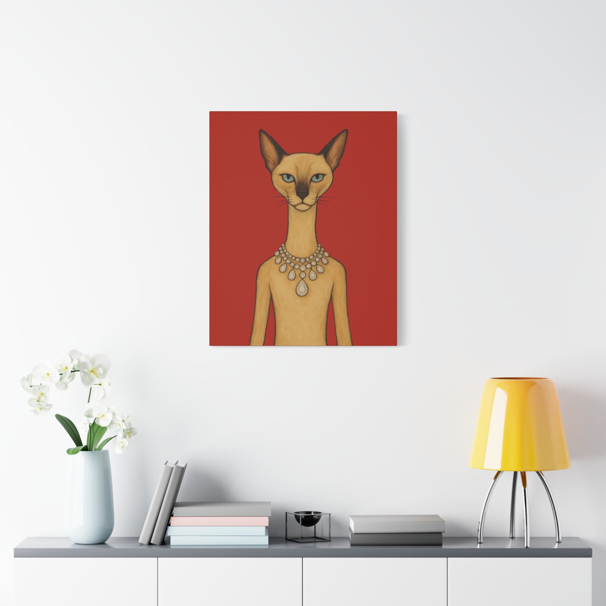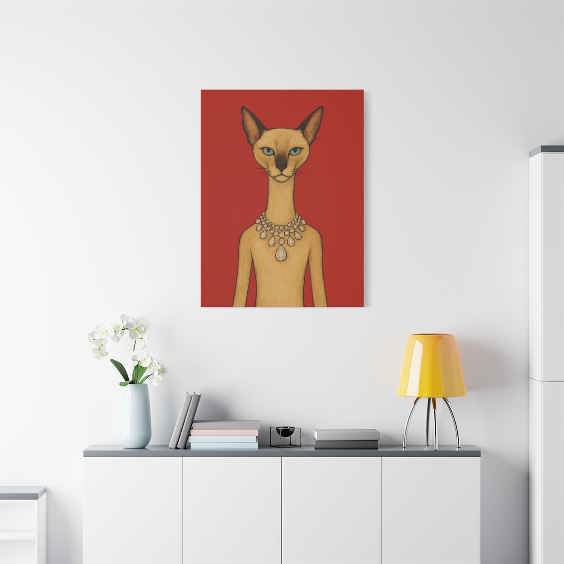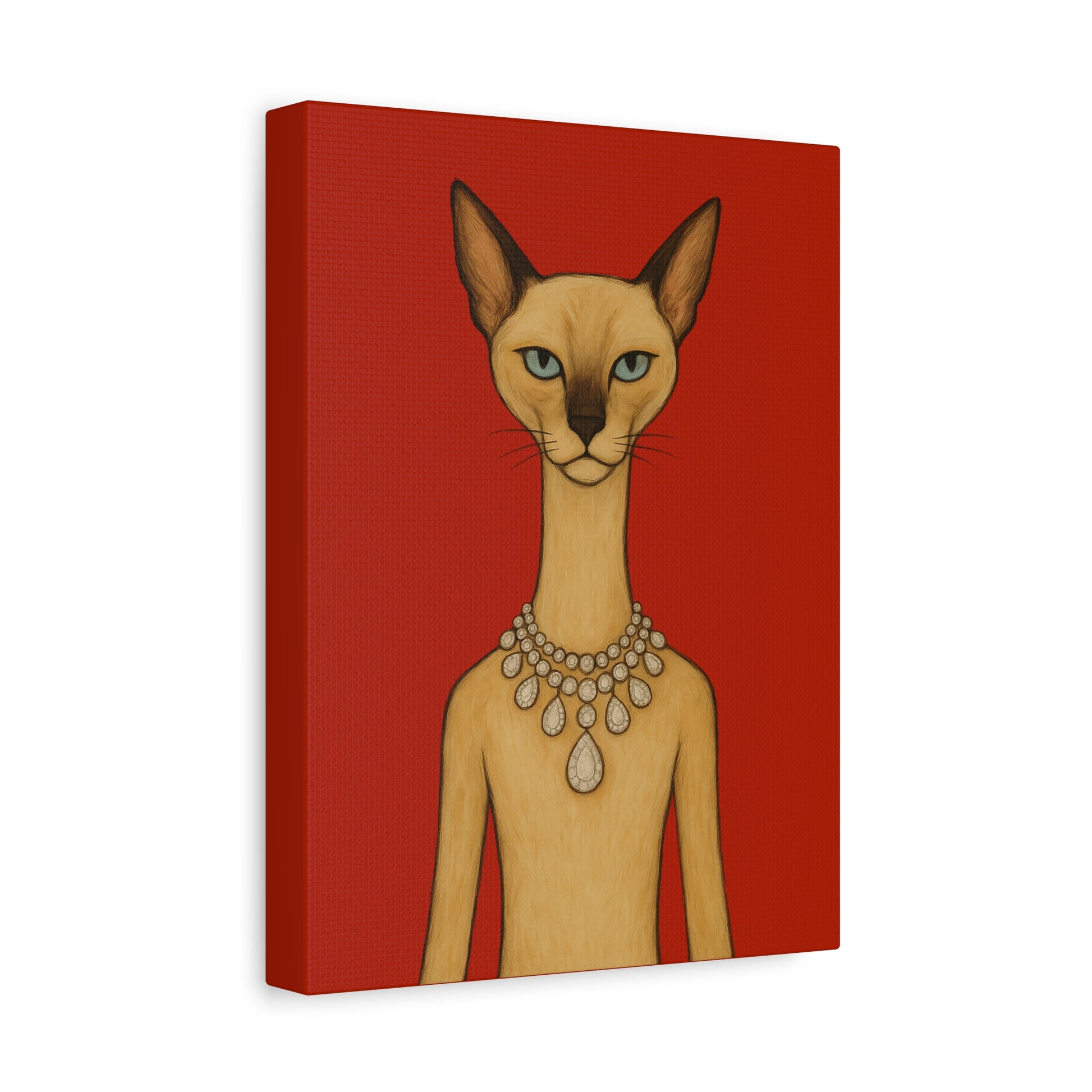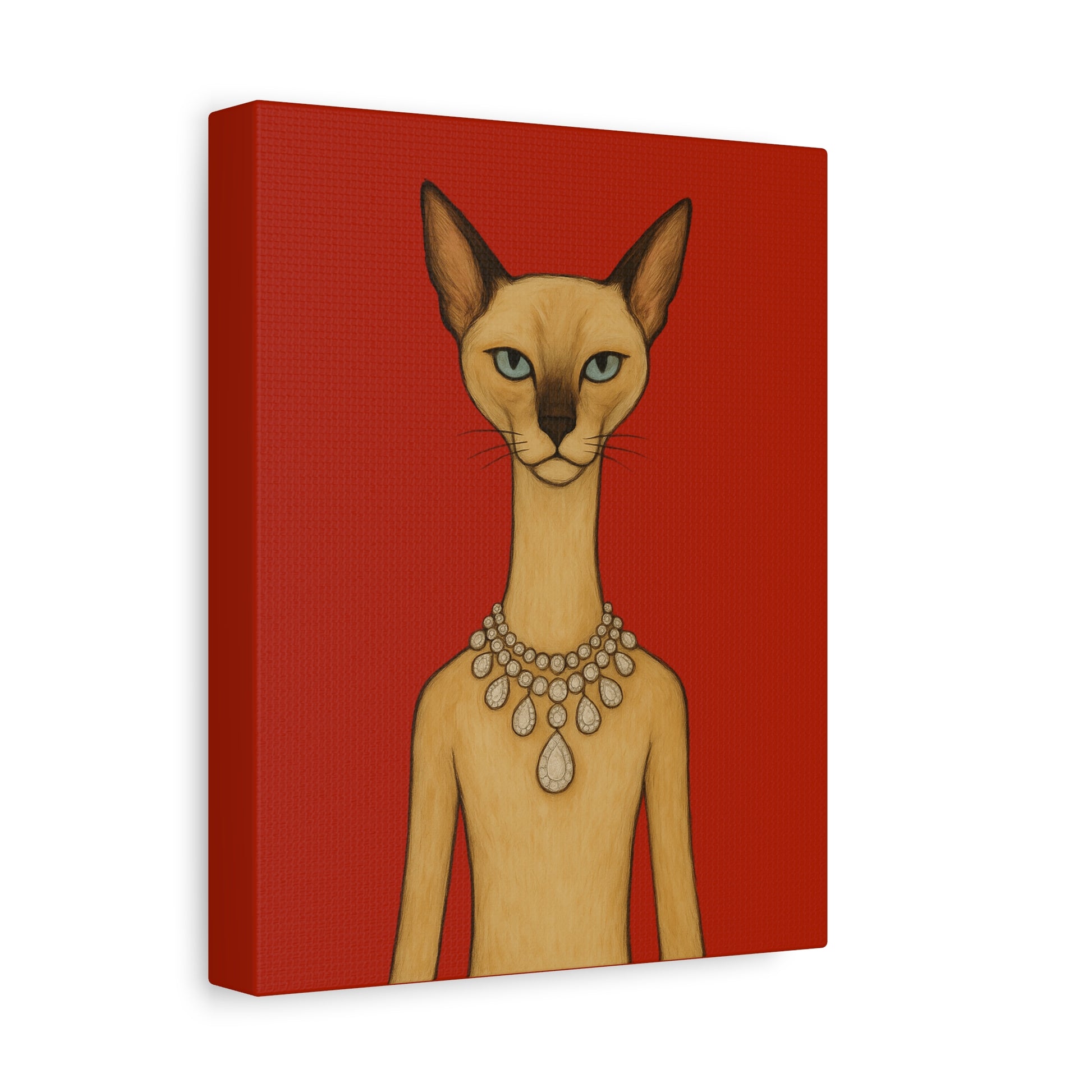 Against a crimson background, a poised feline holds the viewer’s gaze with graceful authority. Its elegant neck is adorned by a luminous diamond necklace, casting serene reflections that contrast with the cat’s innate poise and independence. Its cool, thoughtful gaze engages with gentle irony, contemplating humanity’s pursuit of beauty. The artwork contrasts natural refinement with luxury, exploring themes of independence, elegance, and imposed beauty.