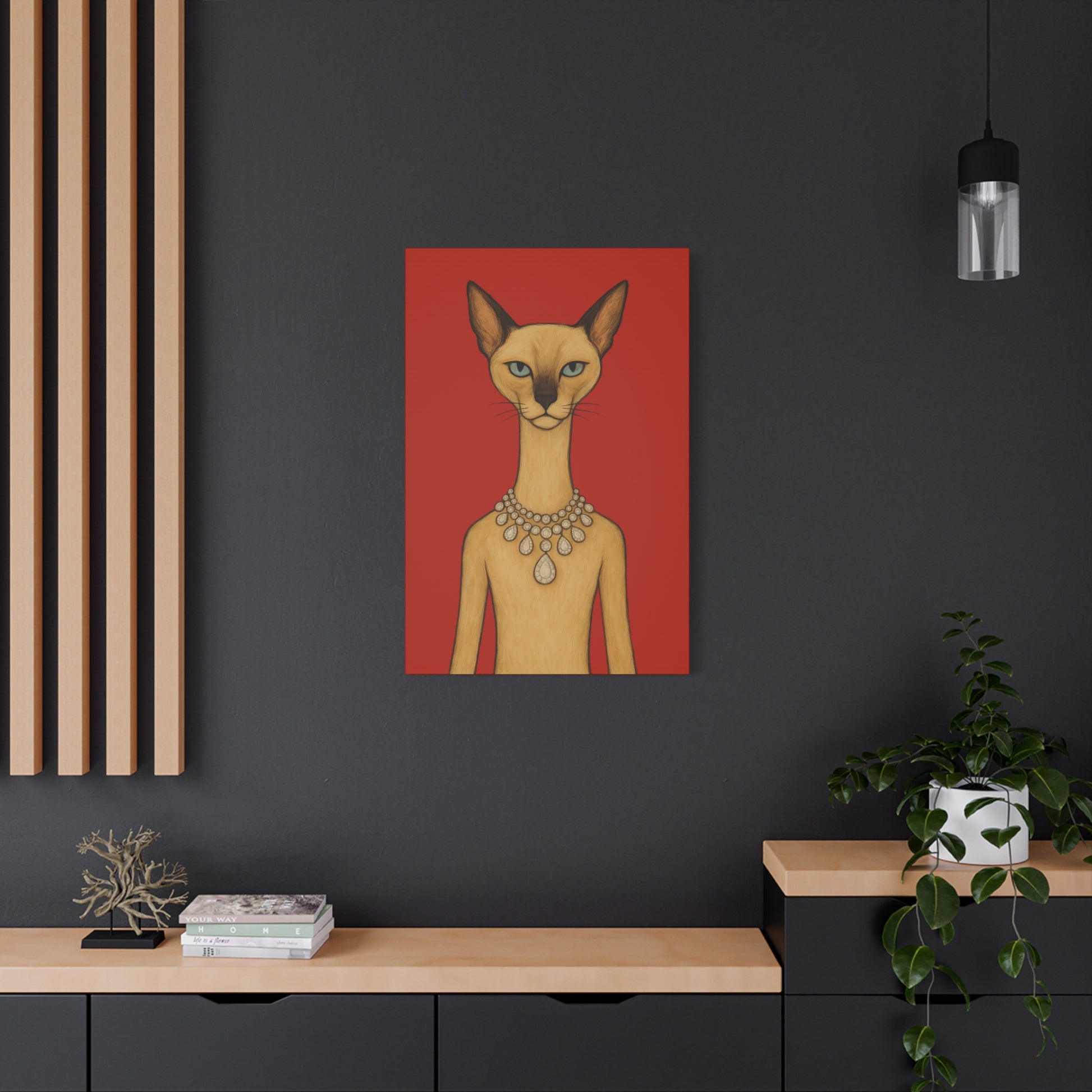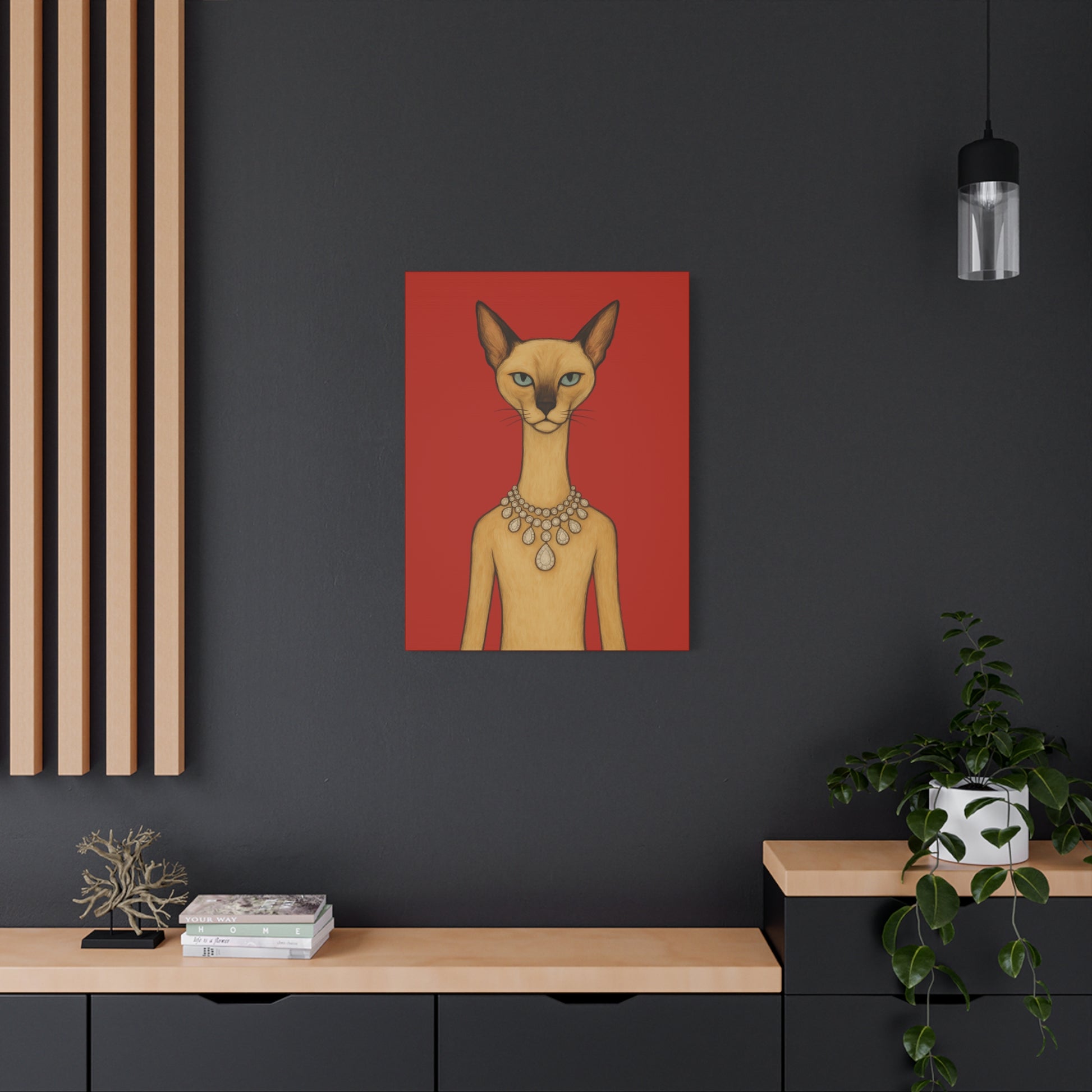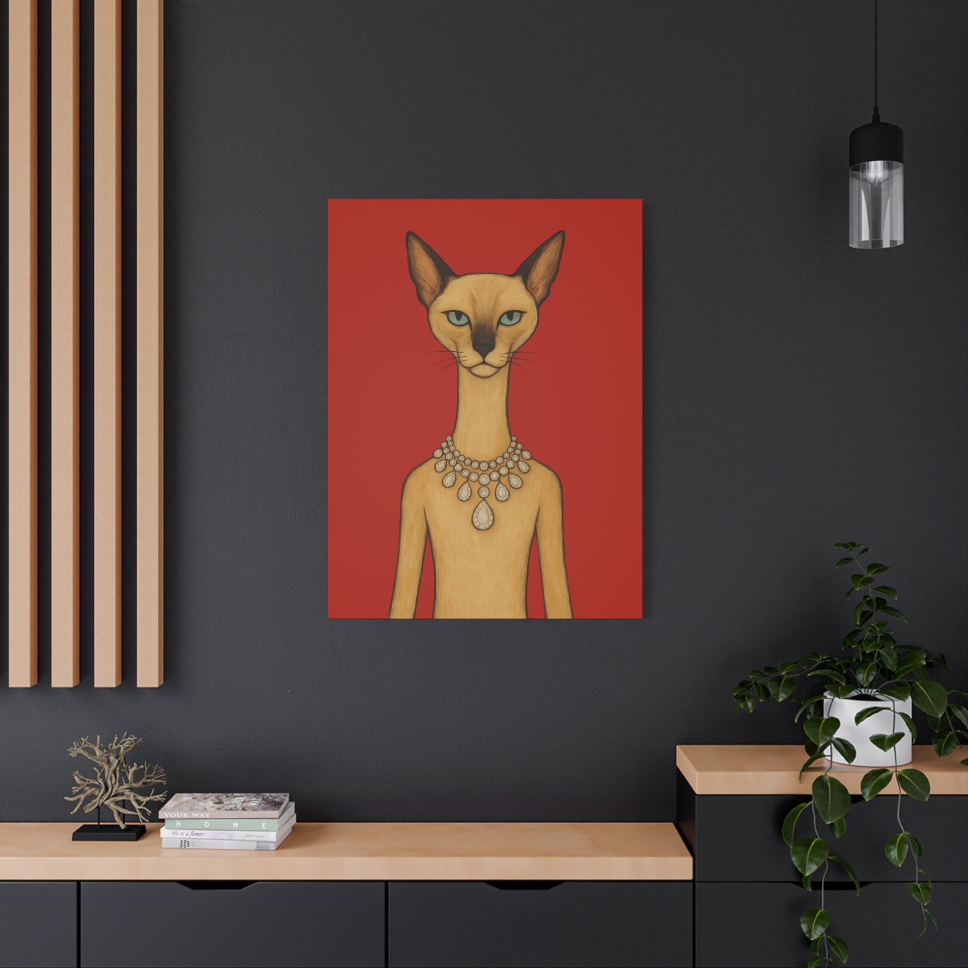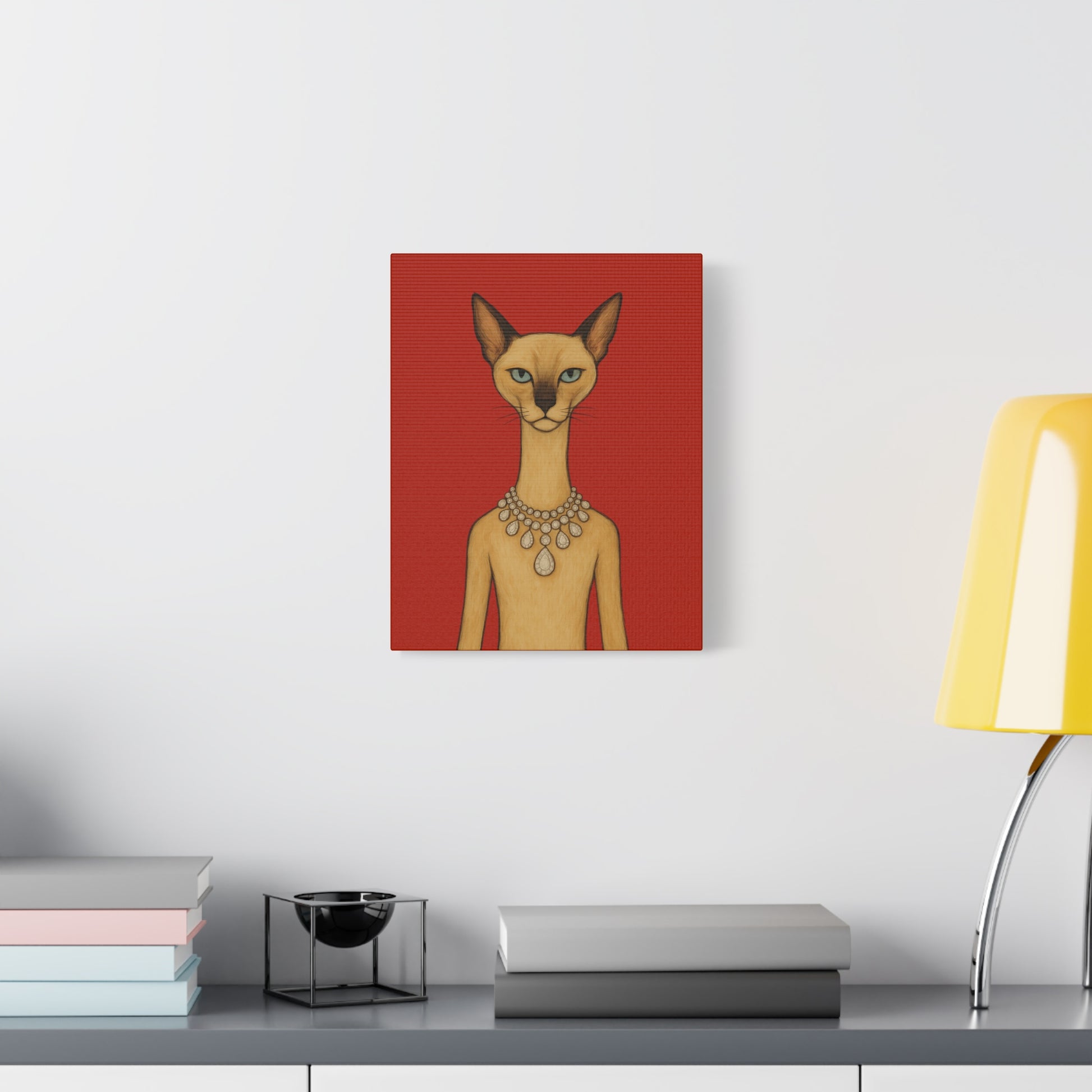 Against a crimson background, a poised feline holds the viewer’s gaze with graceful authority. Its elegant neck is adorned by a luminous diamond necklace, casting serene reflections that contrast with the cat’s innate poise and independence. Its cool, thoughtful gaze engages with gentle irony, contemplating humanity’s pursuit of beauty. The artwork contrasts natural refinement with luxury, exploring themes of independence, elegance, and imposed beauty.