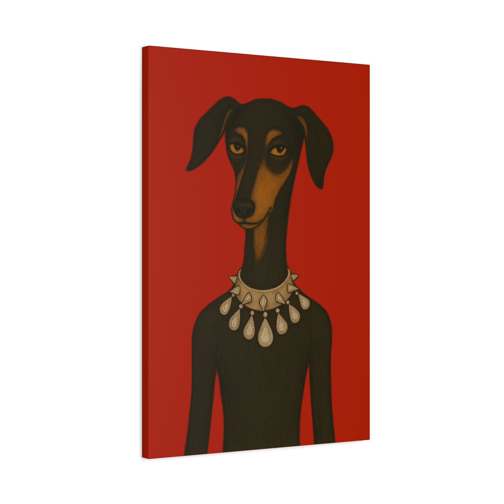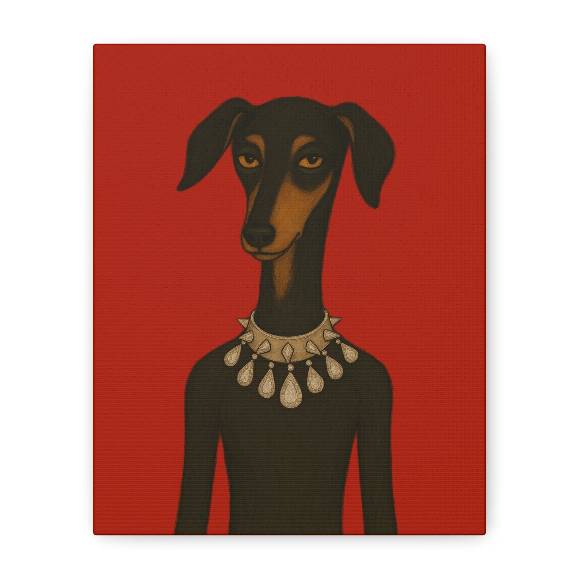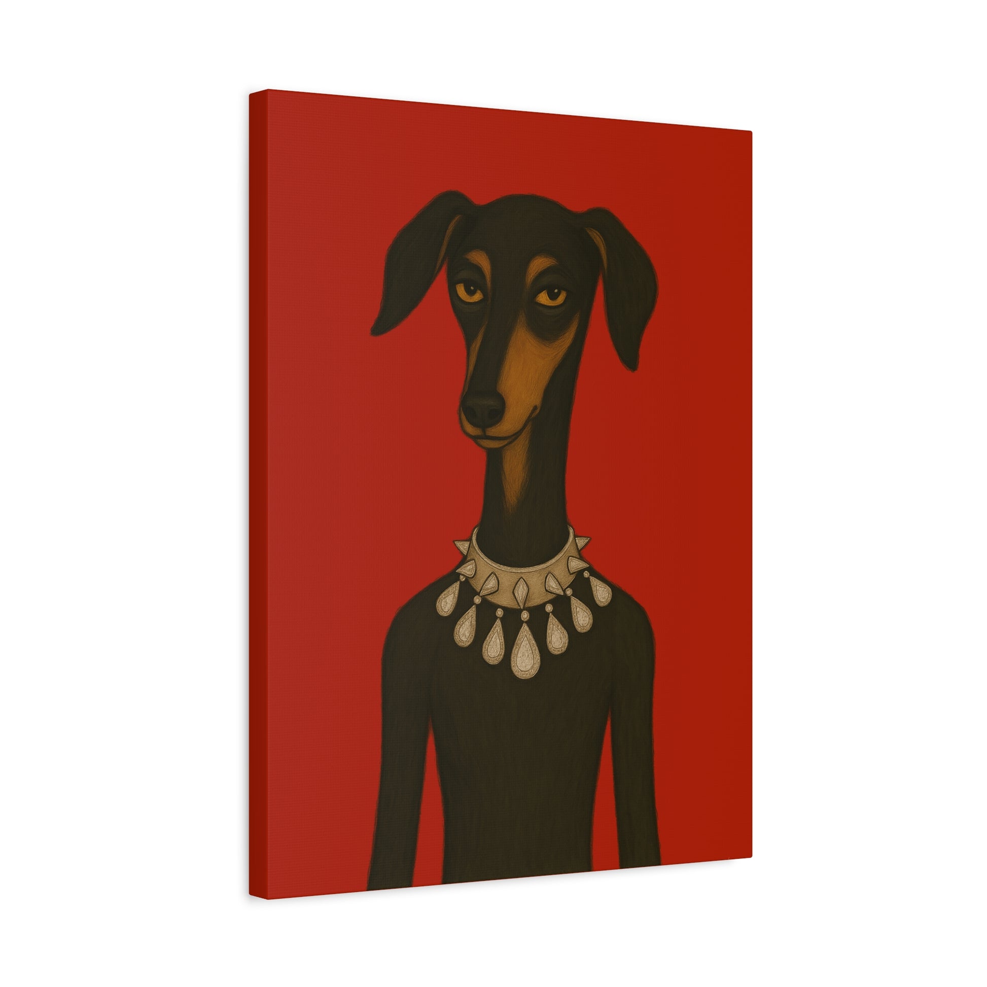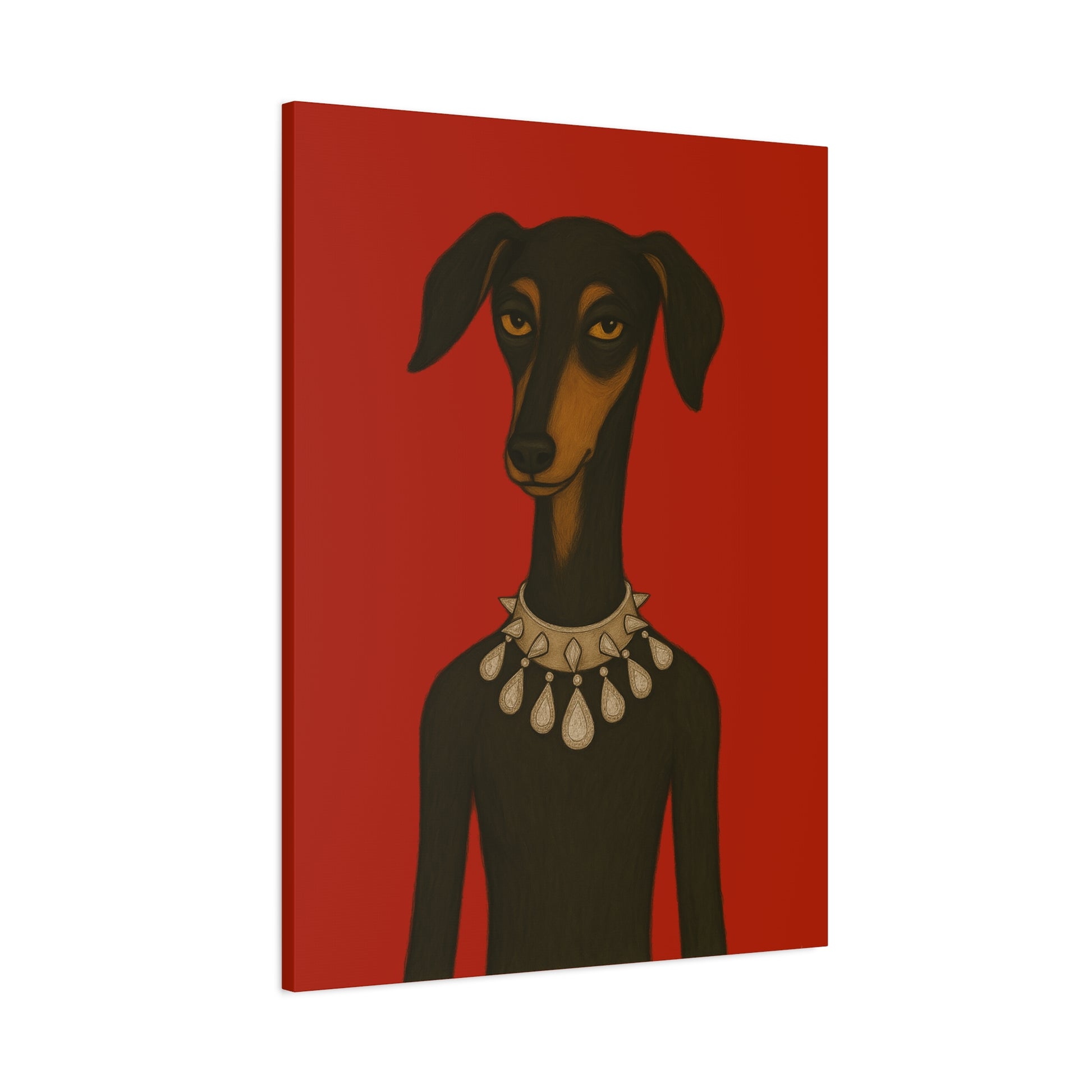 Set against deep crimson, a refined dog commands the frame. Its slender neck bears a sophisticated collar studded with dazzling diamonds, casting glimmers that starkly contrast its domesticated loyalty. Its knowing, affectionate gaze suggests amused tolerance of human vanity. This juxtaposition explores companionship, luxury, and the nature of adornment.