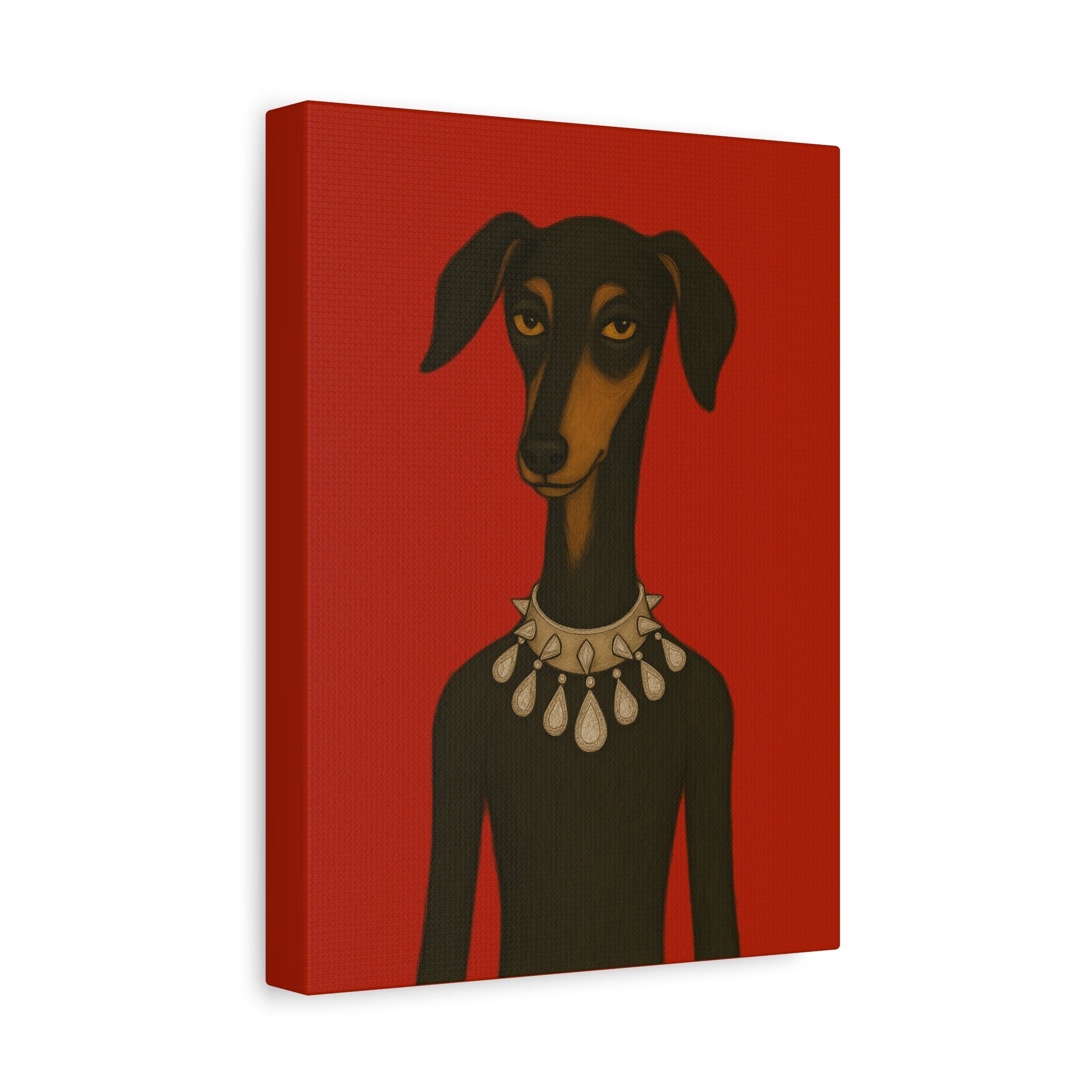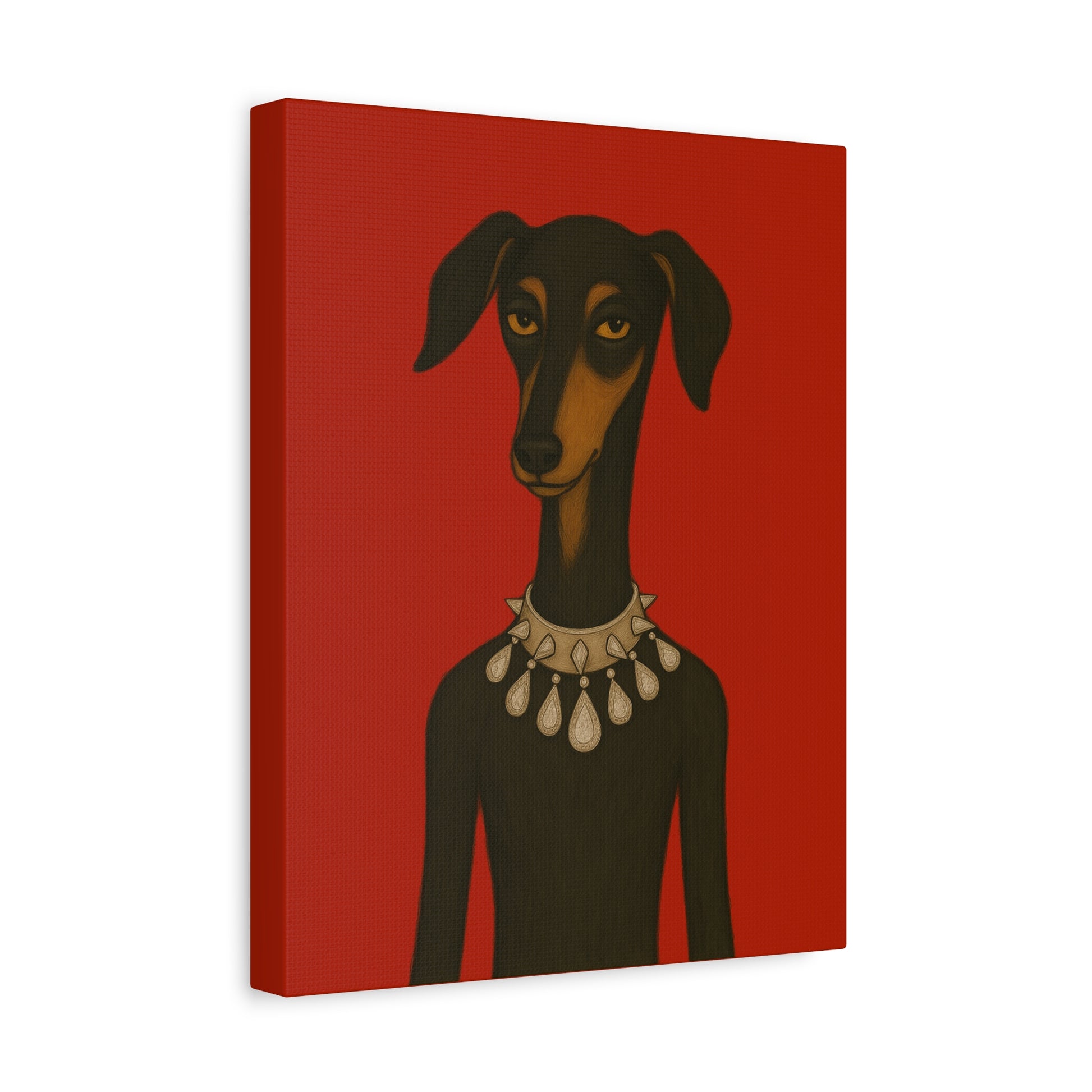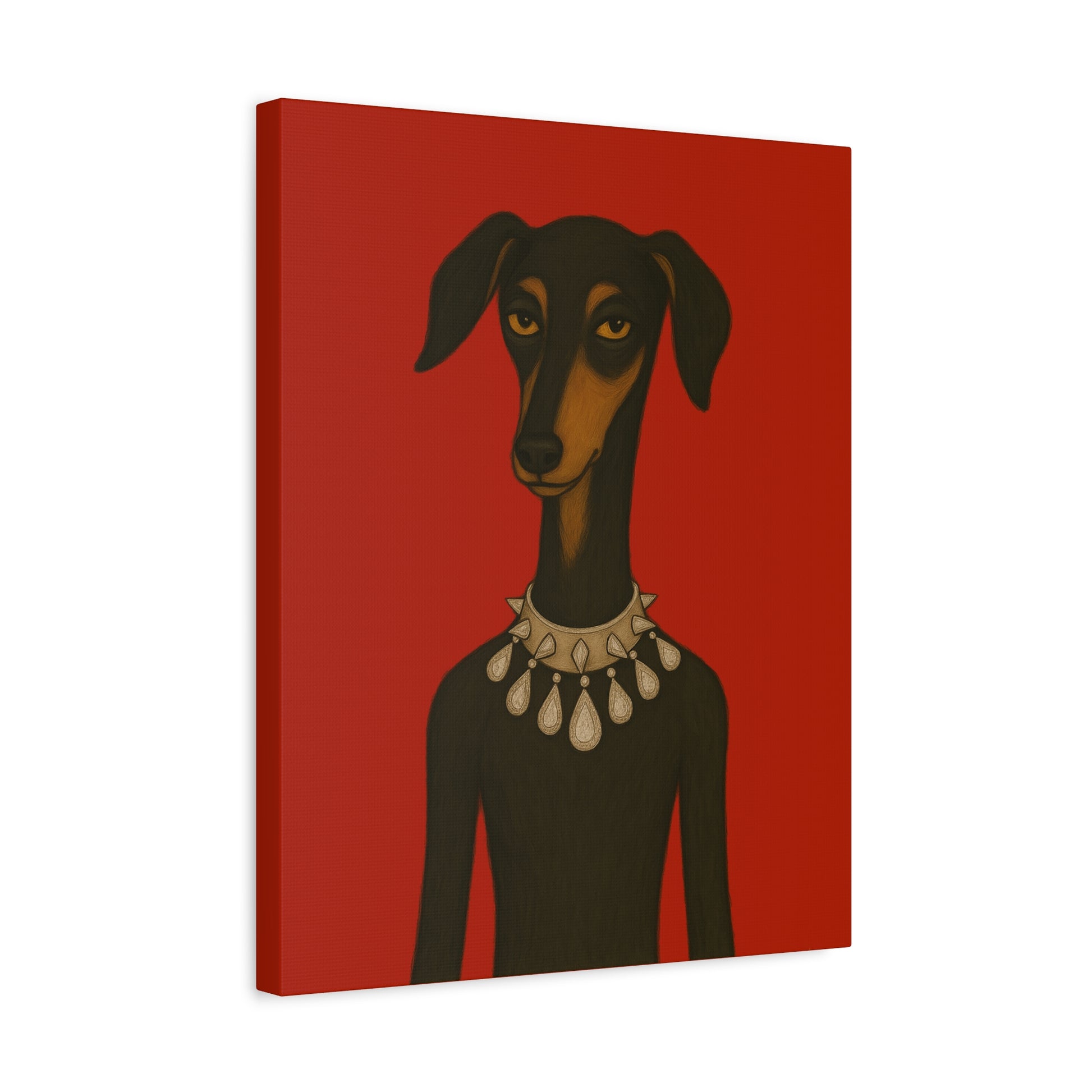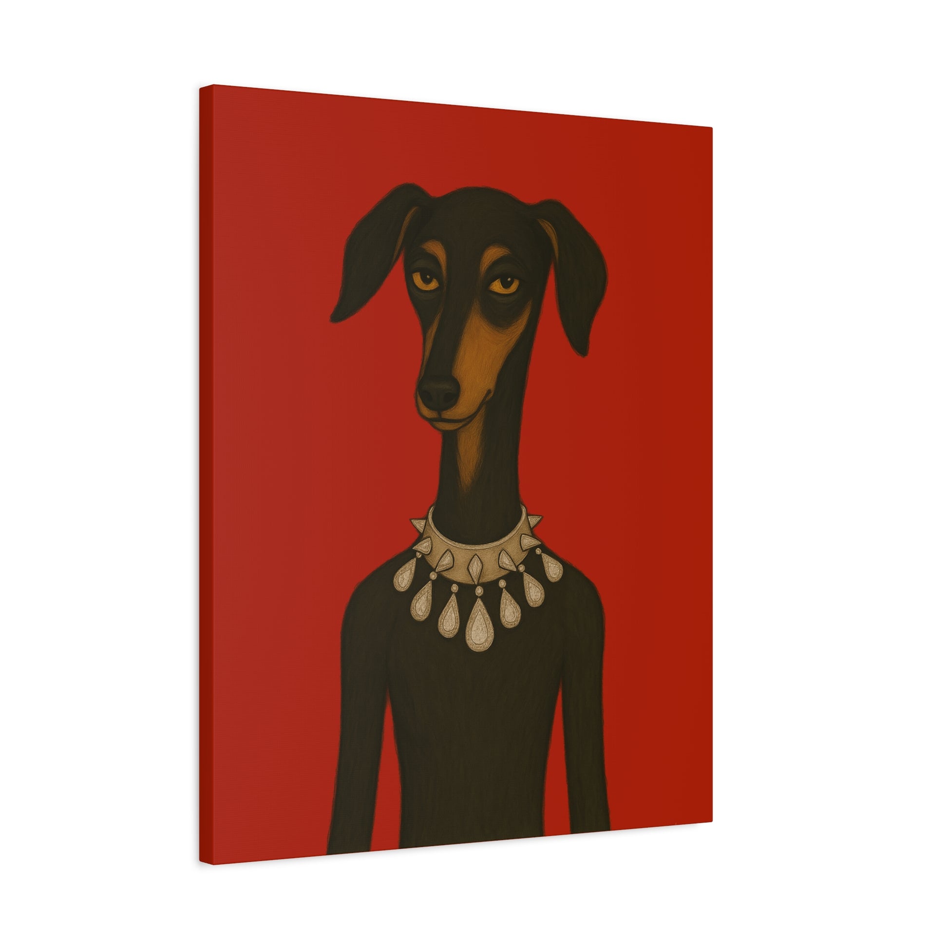 Set against deep crimson, a refined dog commands the frame. Its slender neck bears a sophisticated collar studded with dazzling diamonds, casting glimmers that starkly contrast its domesticated loyalty. Its knowing, affectionate gaze suggests amused tolerance of human vanity. This juxtaposition explores companionship, luxury, and the nature of adornment.