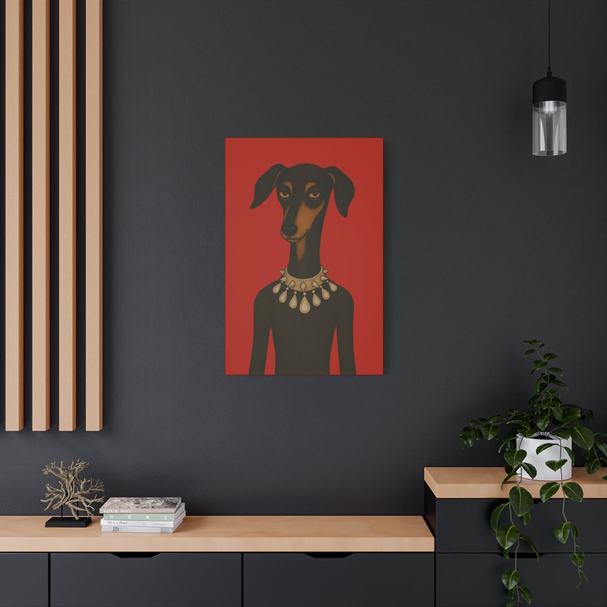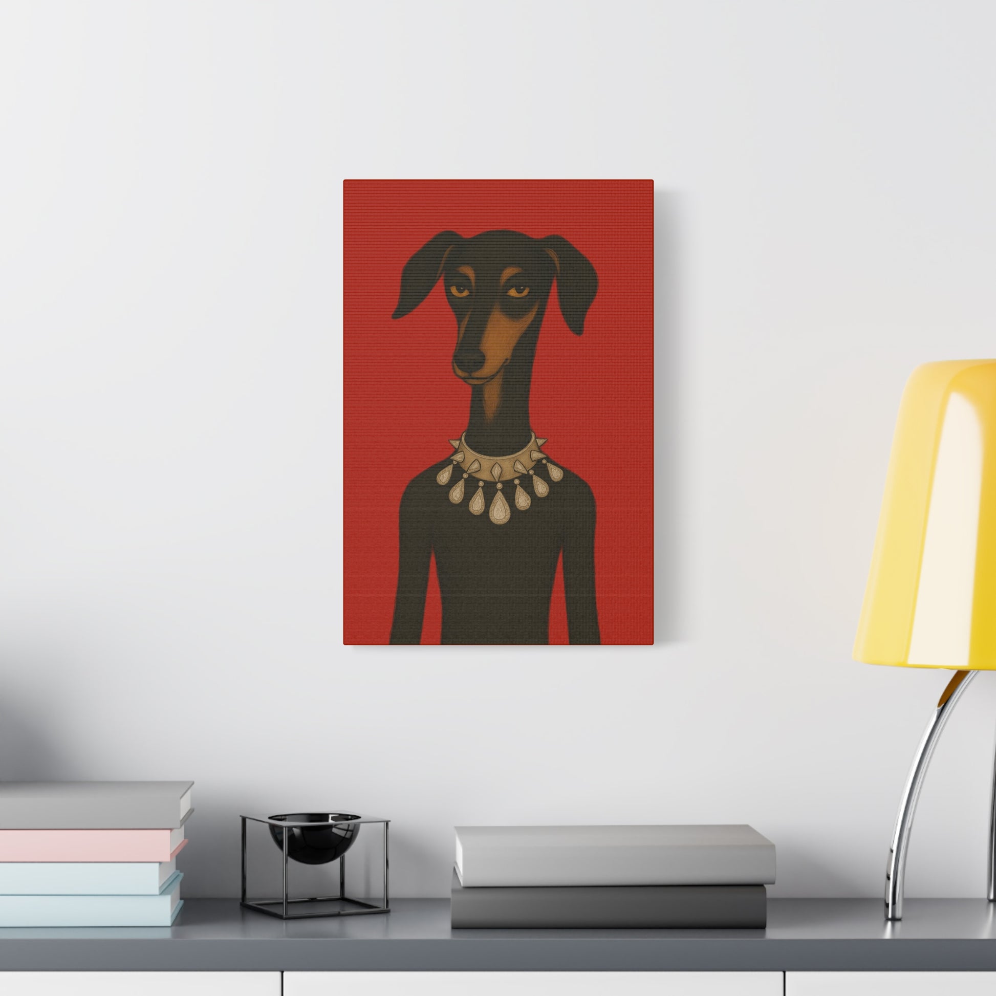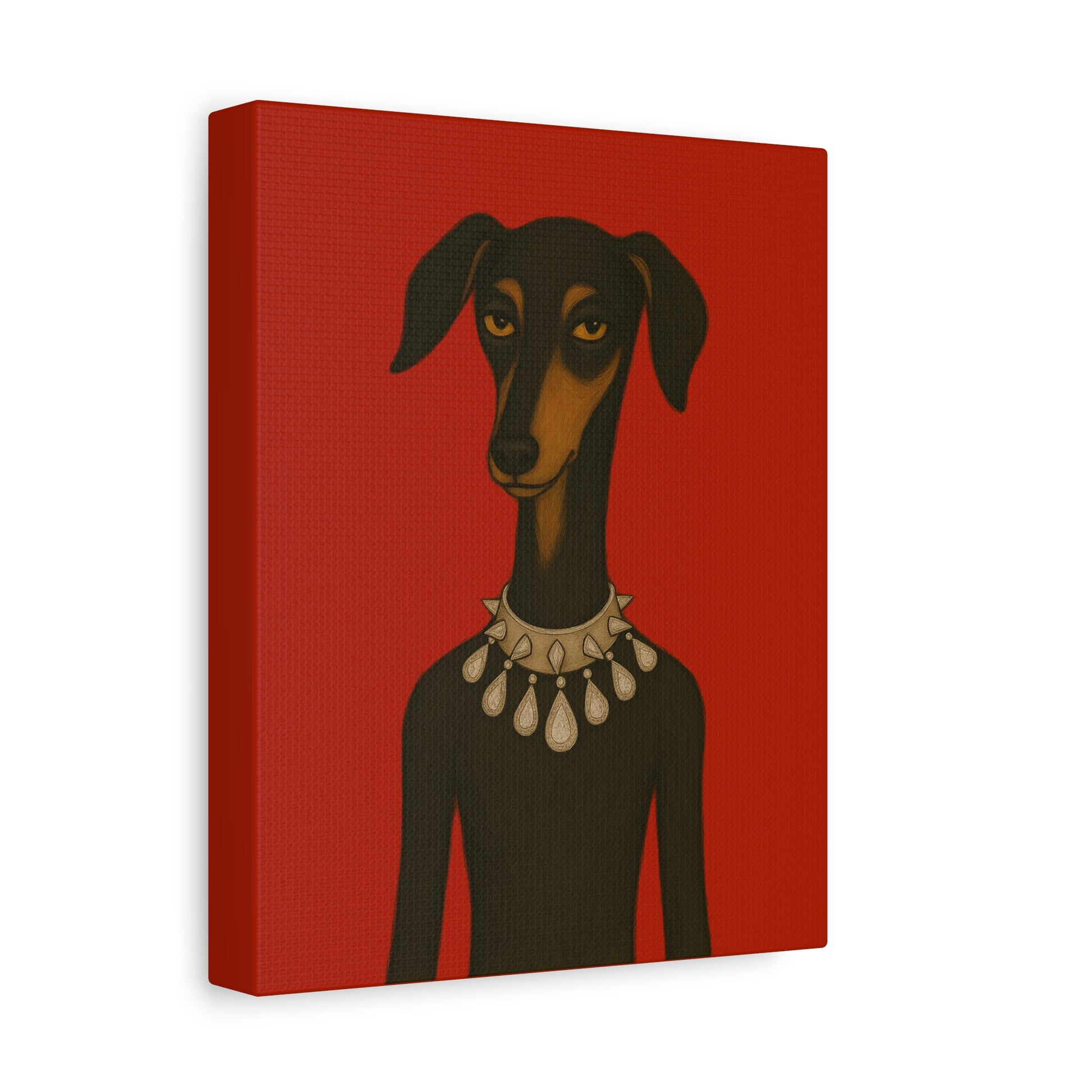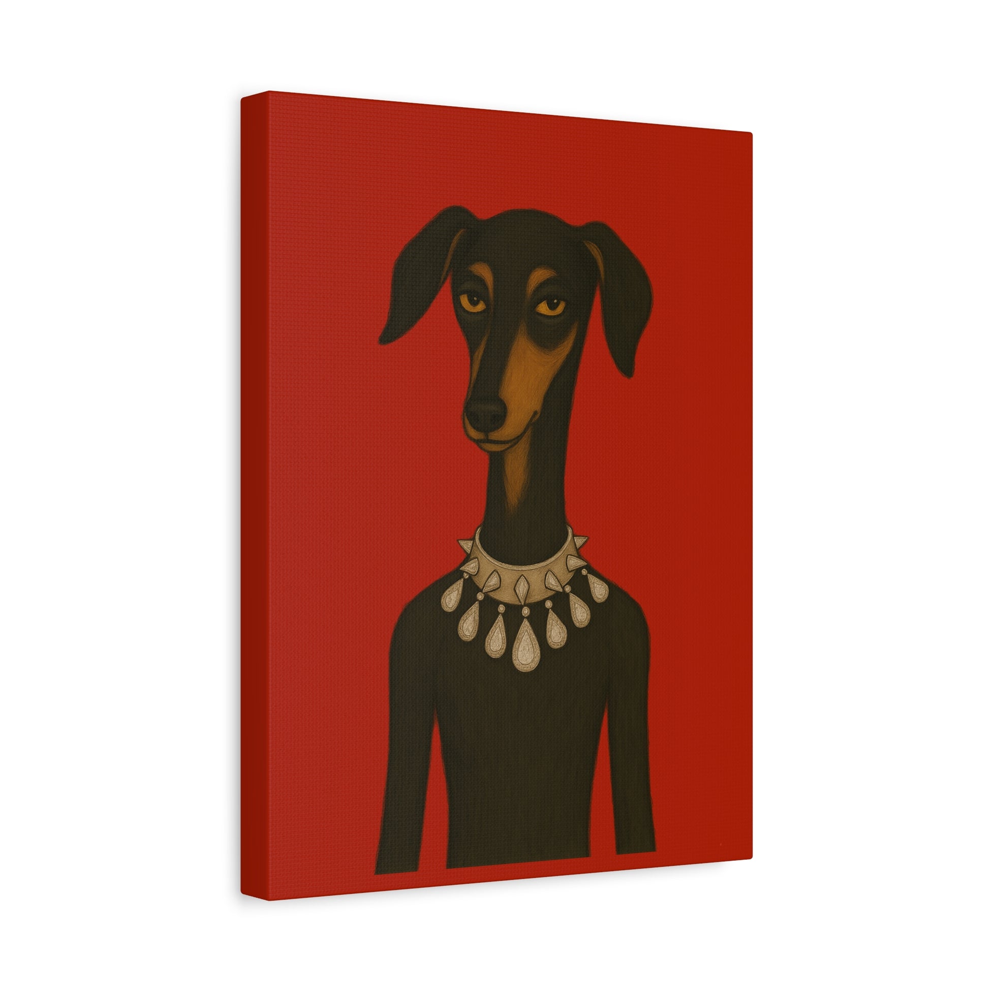 Set against deep crimson, a refined dog commands the frame. Its slender neck bears a sophisticated collar studded with dazzling diamonds, casting glimmers that starkly contrast its domesticated loyalty. Its knowing, affectionate gaze suggests amused tolerance of human vanity. This juxtaposition explores companionship, luxury, and the nature of adornment.