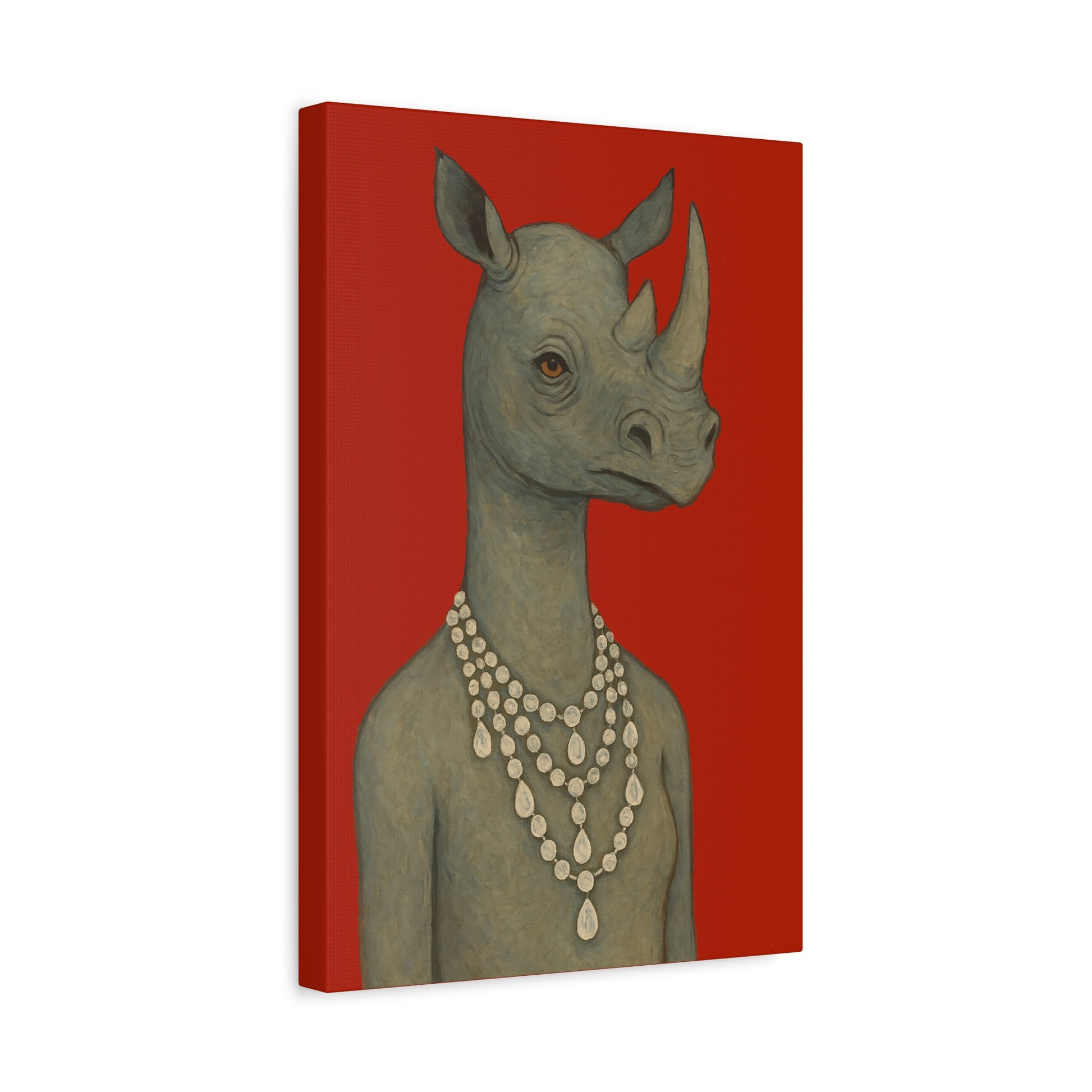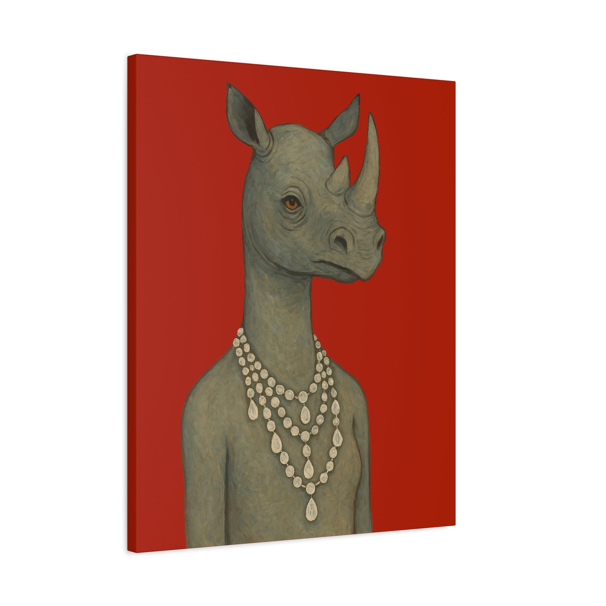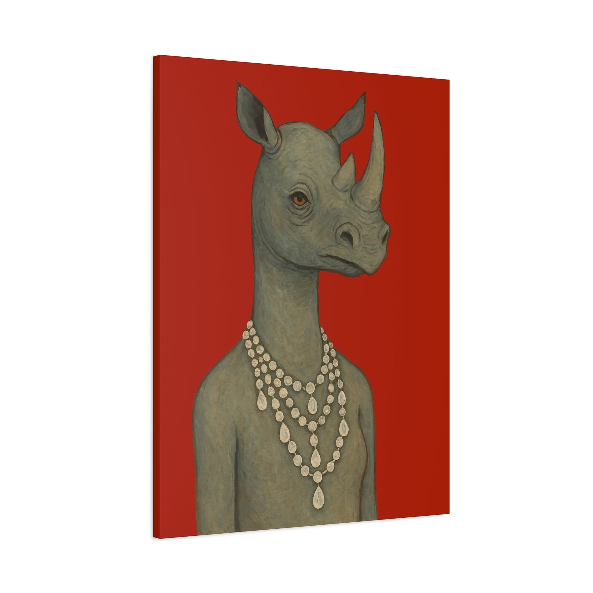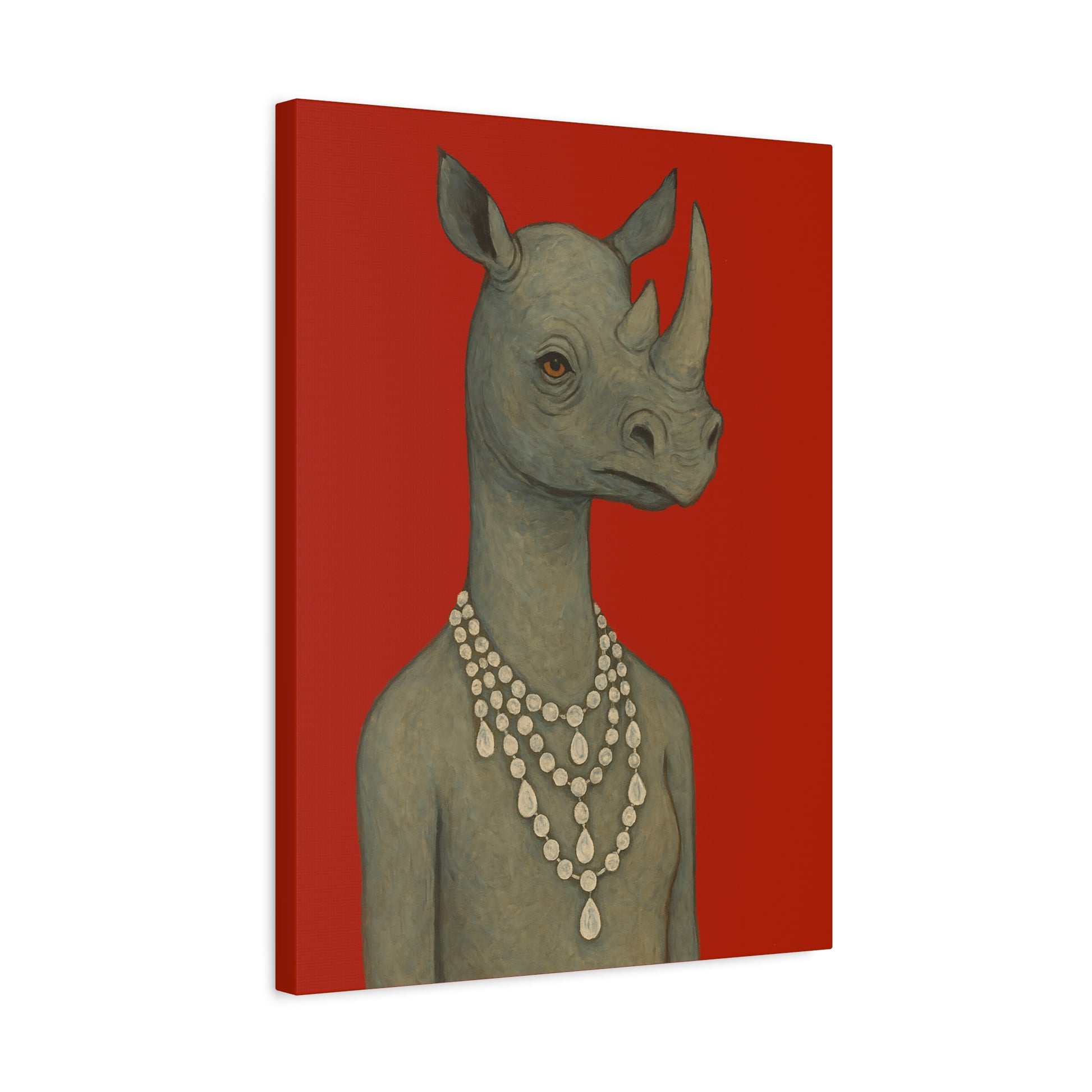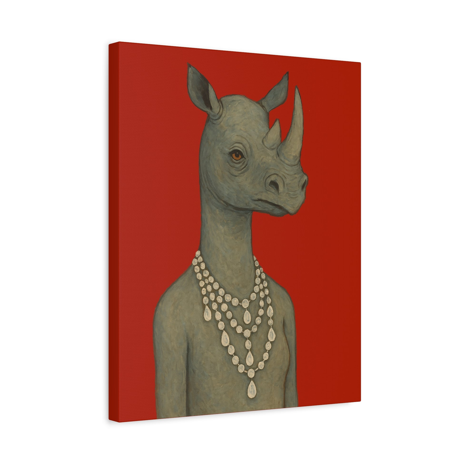 Against a striking crimson backdrop, a robust rhinoceros commands attention. Its strong, armored neck bears a glittering array of diamonds, creating subtle light effects contrasting sharply with the animal’s powerful resilience. Its steady gaze, calm and profound, conveys quiet contemplation of its adorned state. This contrast of wild durability and precious adornment probes ideas of strength, value, and human interference.