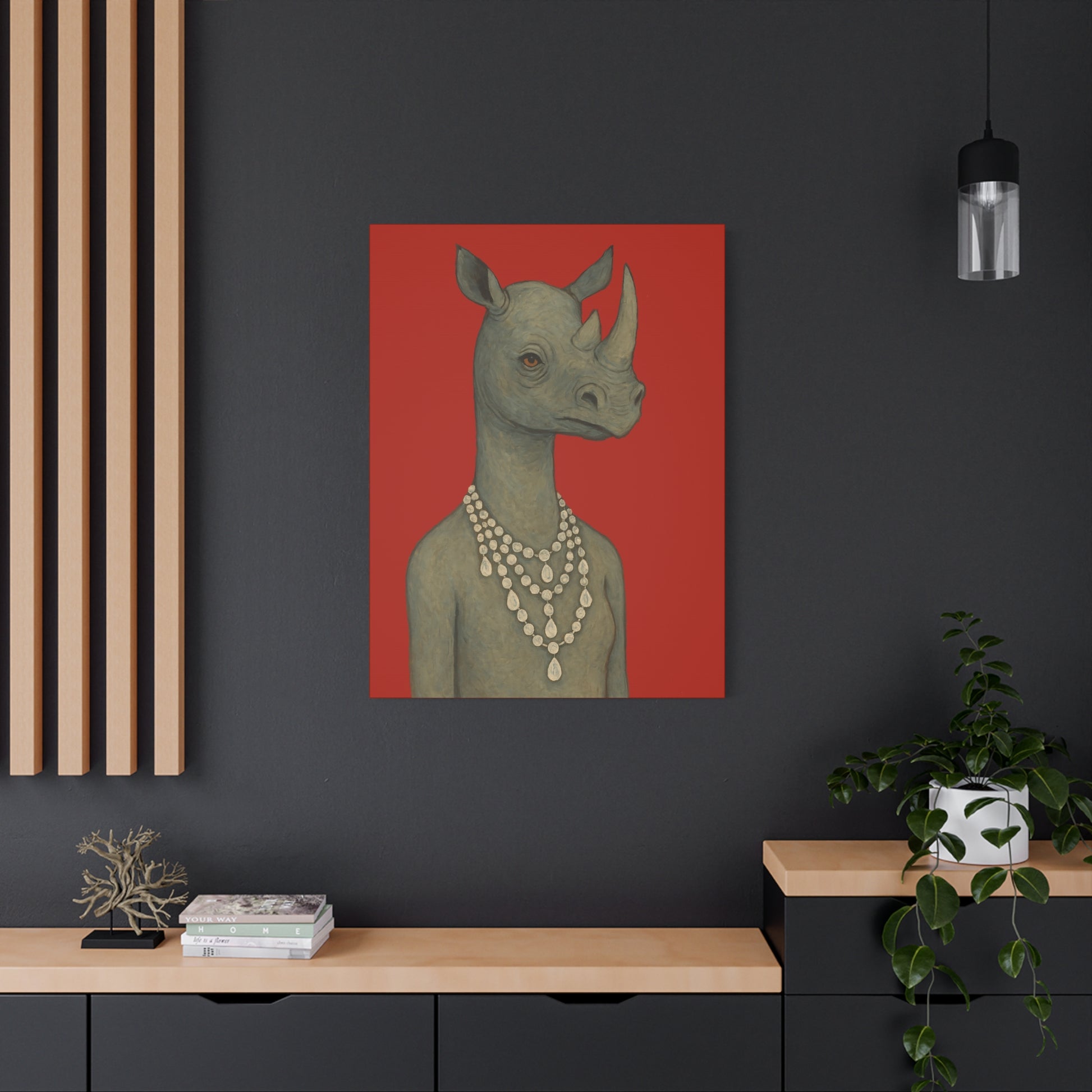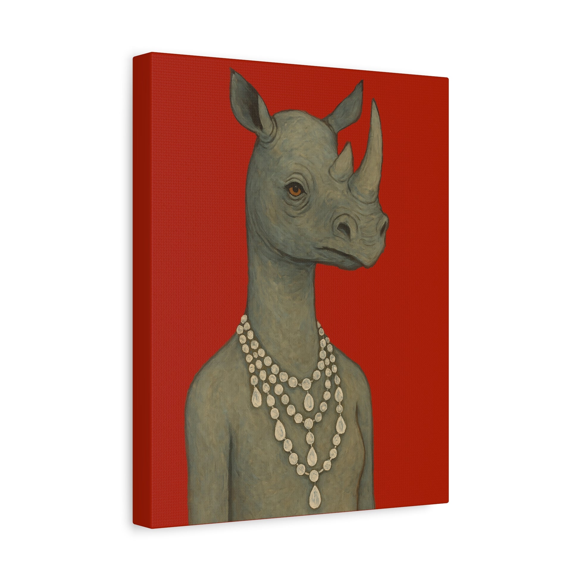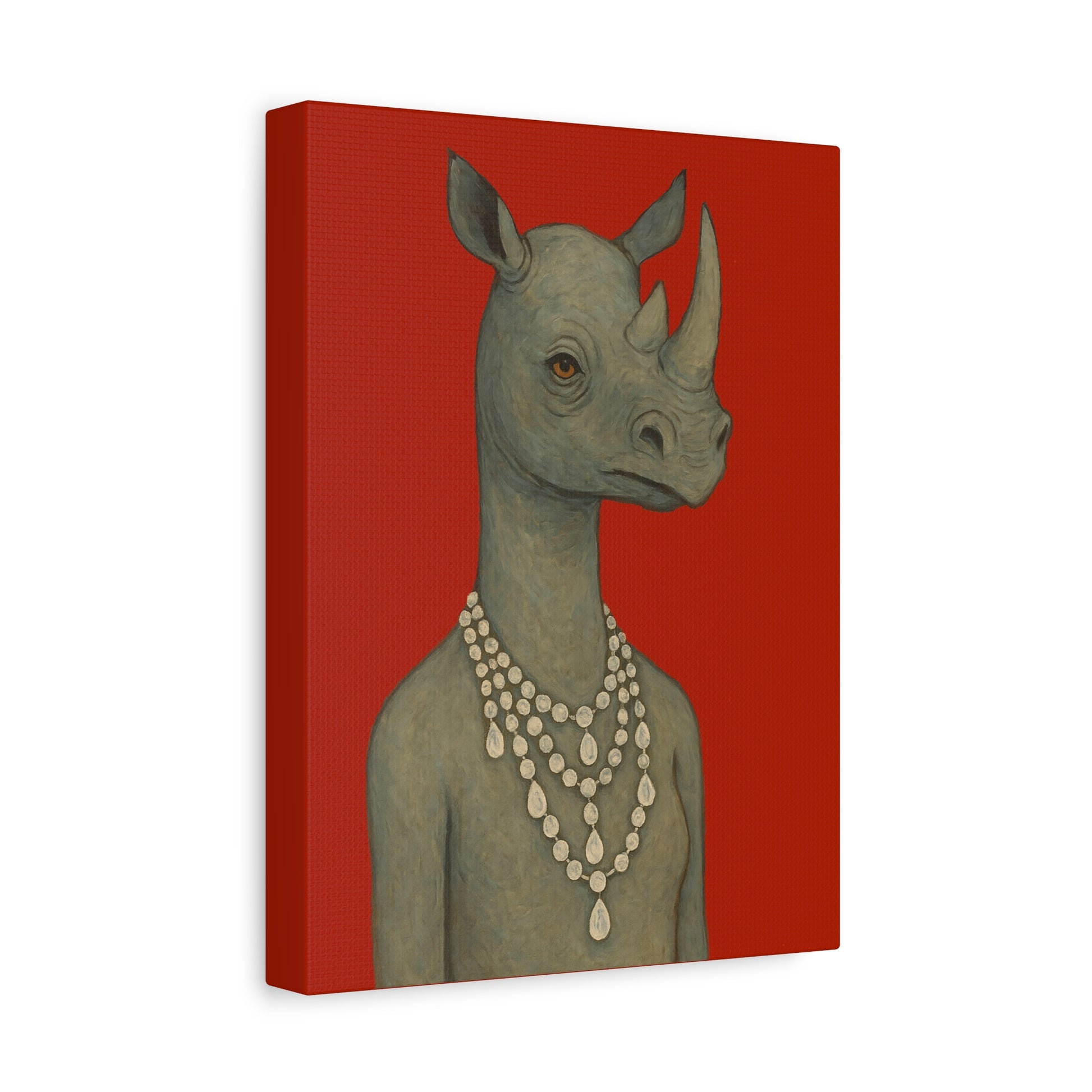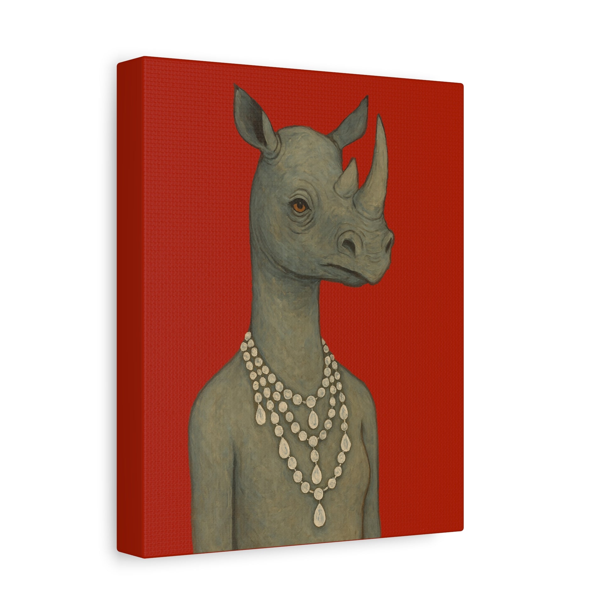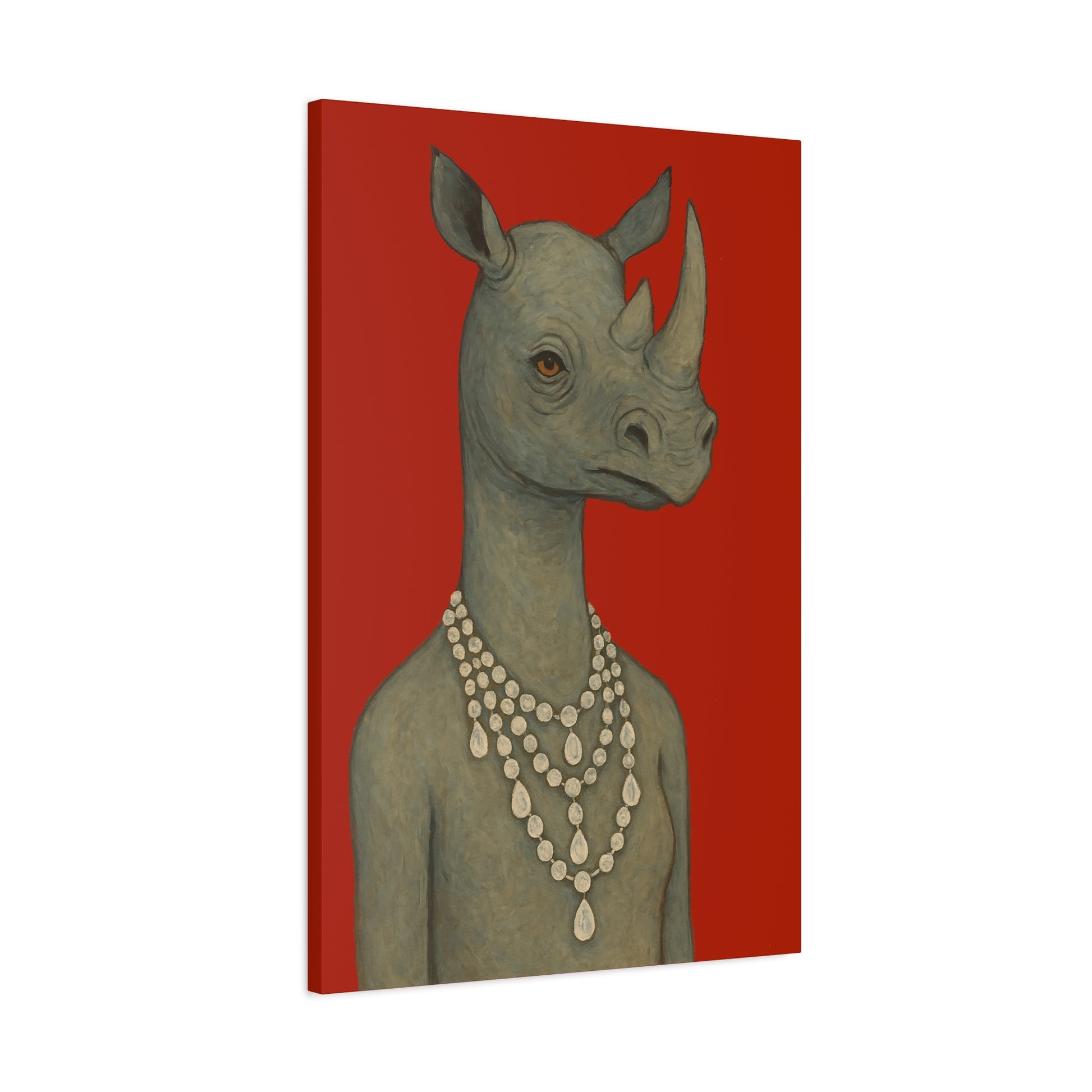 Against a striking crimson backdrop, a robust rhinoceros commands attention. Its strong, armored neck bears a glittering array of diamonds, creating subtle light effects contrasting sharply with the animal’s powerful resilience. Its steady gaze, calm and profound, conveys quiet contemplation of its adorned state. This contrast of wild durability and precious adornment probes ideas of strength, value, and human interference.