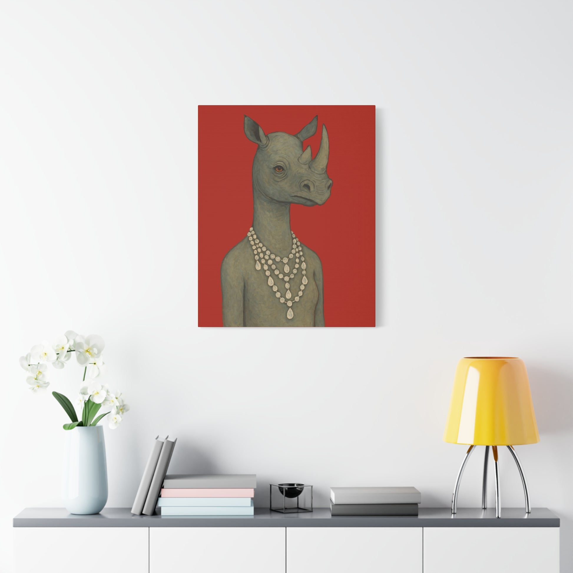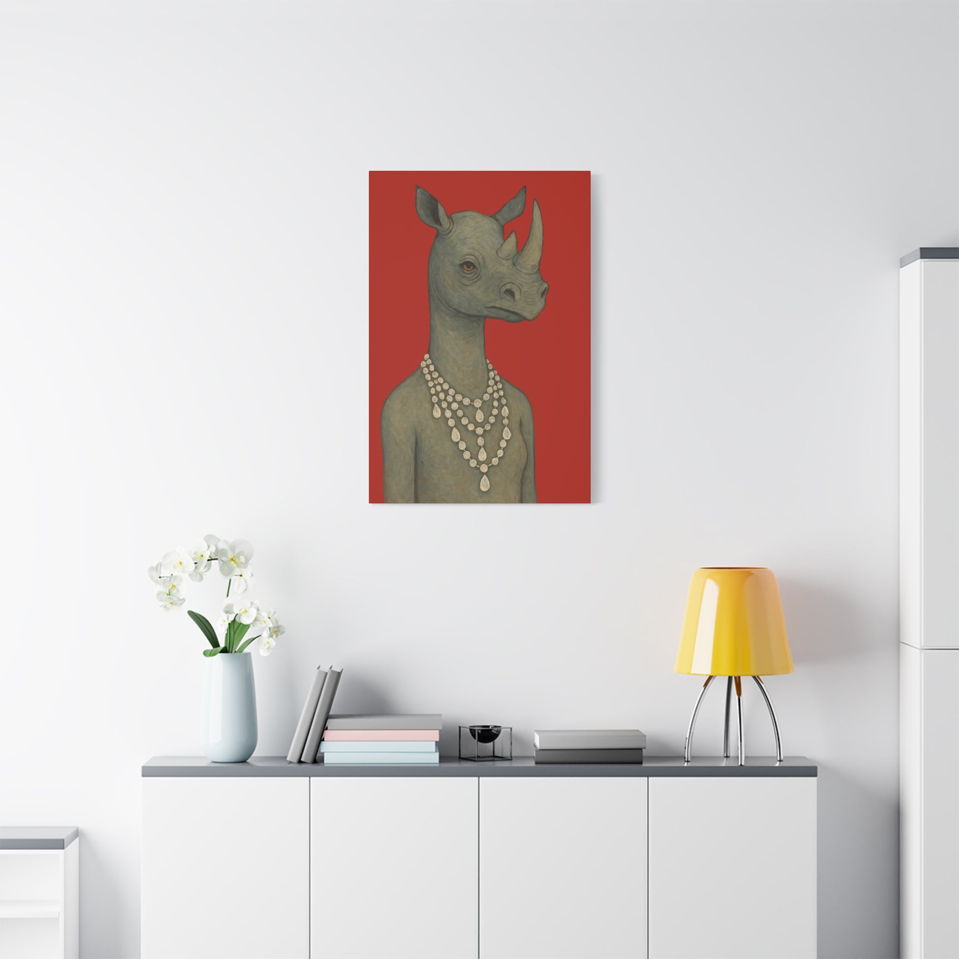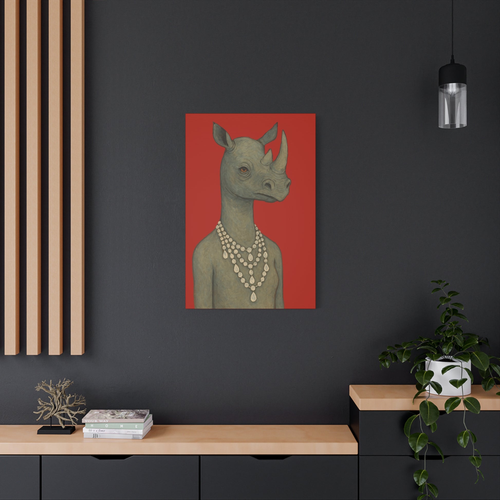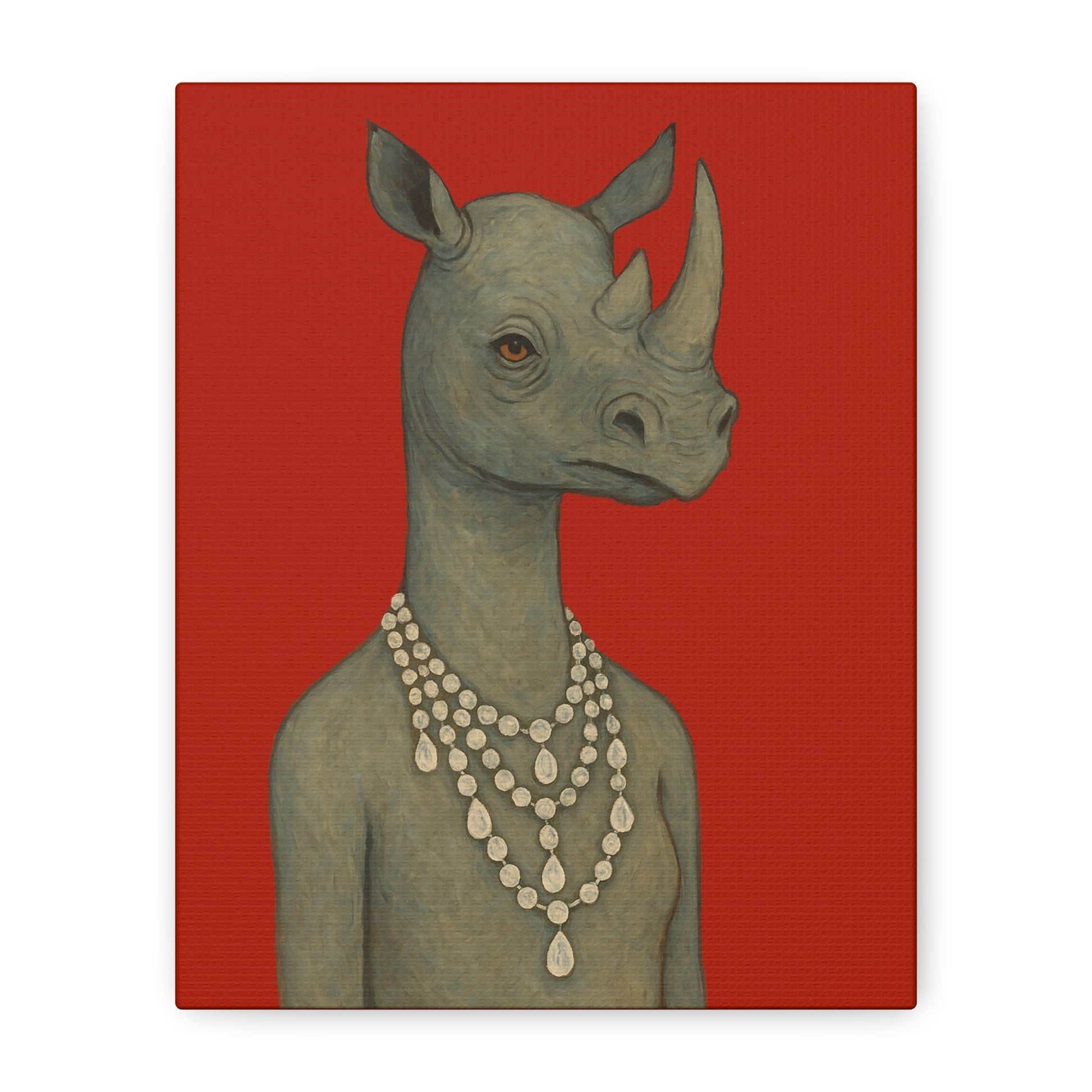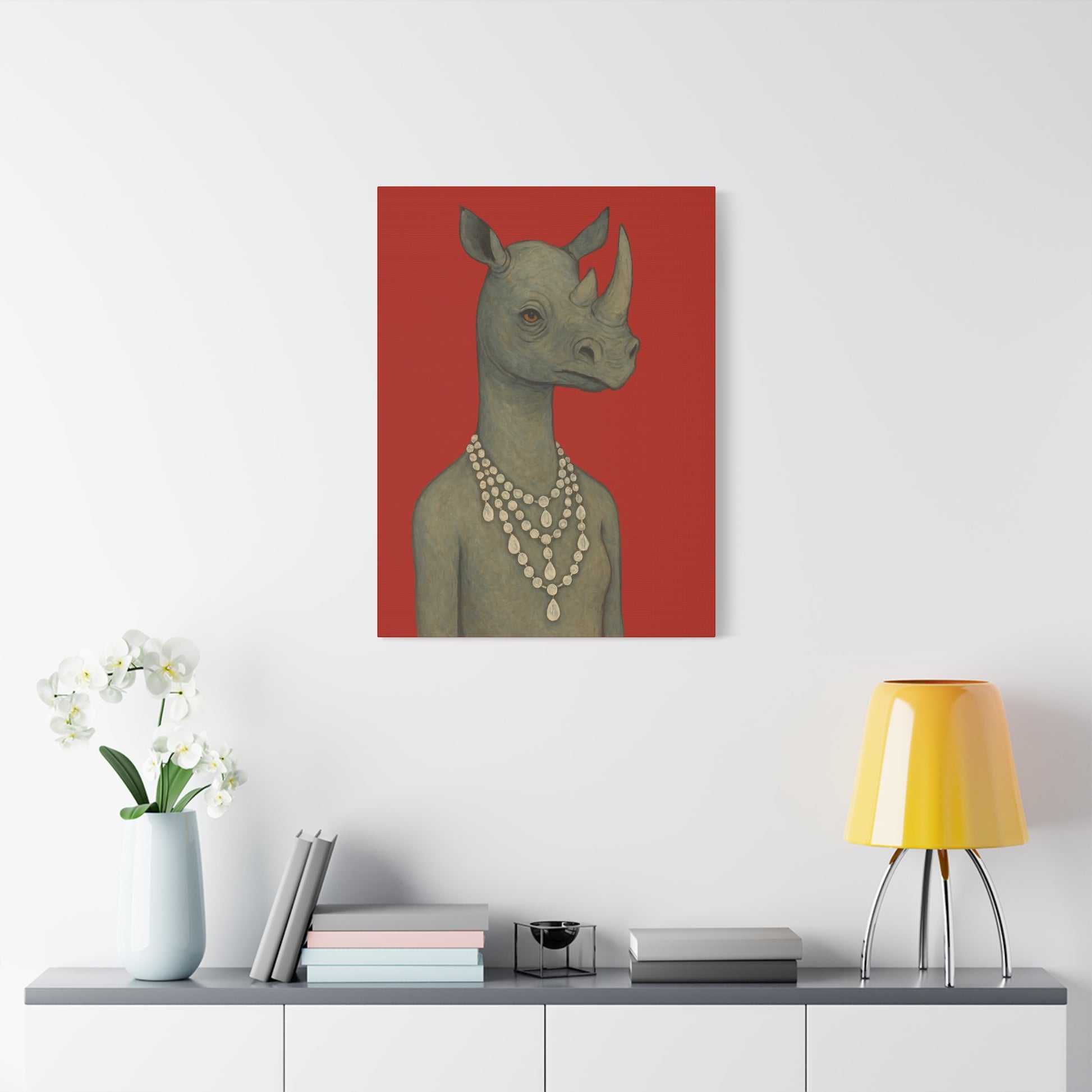 Against a striking crimson backdrop, a robust rhinoceros commands attention. Its strong, armored neck bears a glittering array of diamonds, creating subtle light effects contrasting sharply with the animal’s powerful resilience. Its steady gaze, calm and profound, conveys quiet contemplation of its adorned state. This contrast of wild durability and precious adornment probes ideas of strength, value, and human interference.