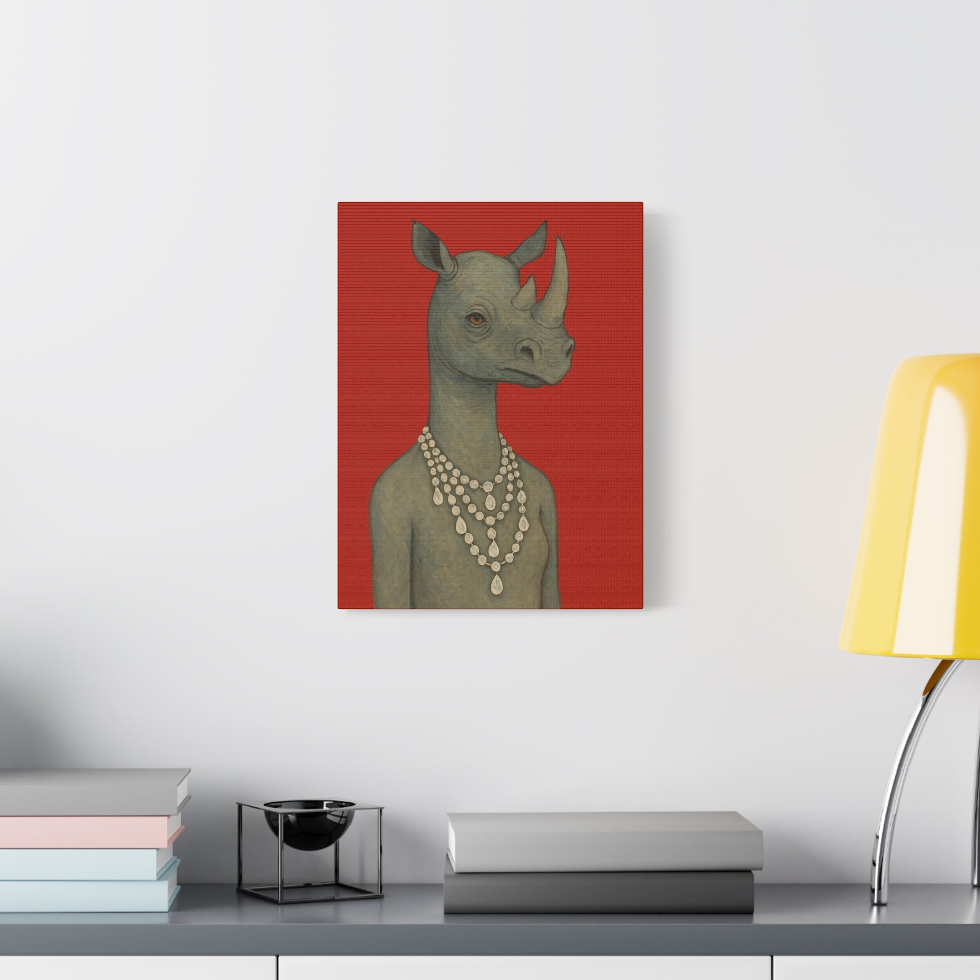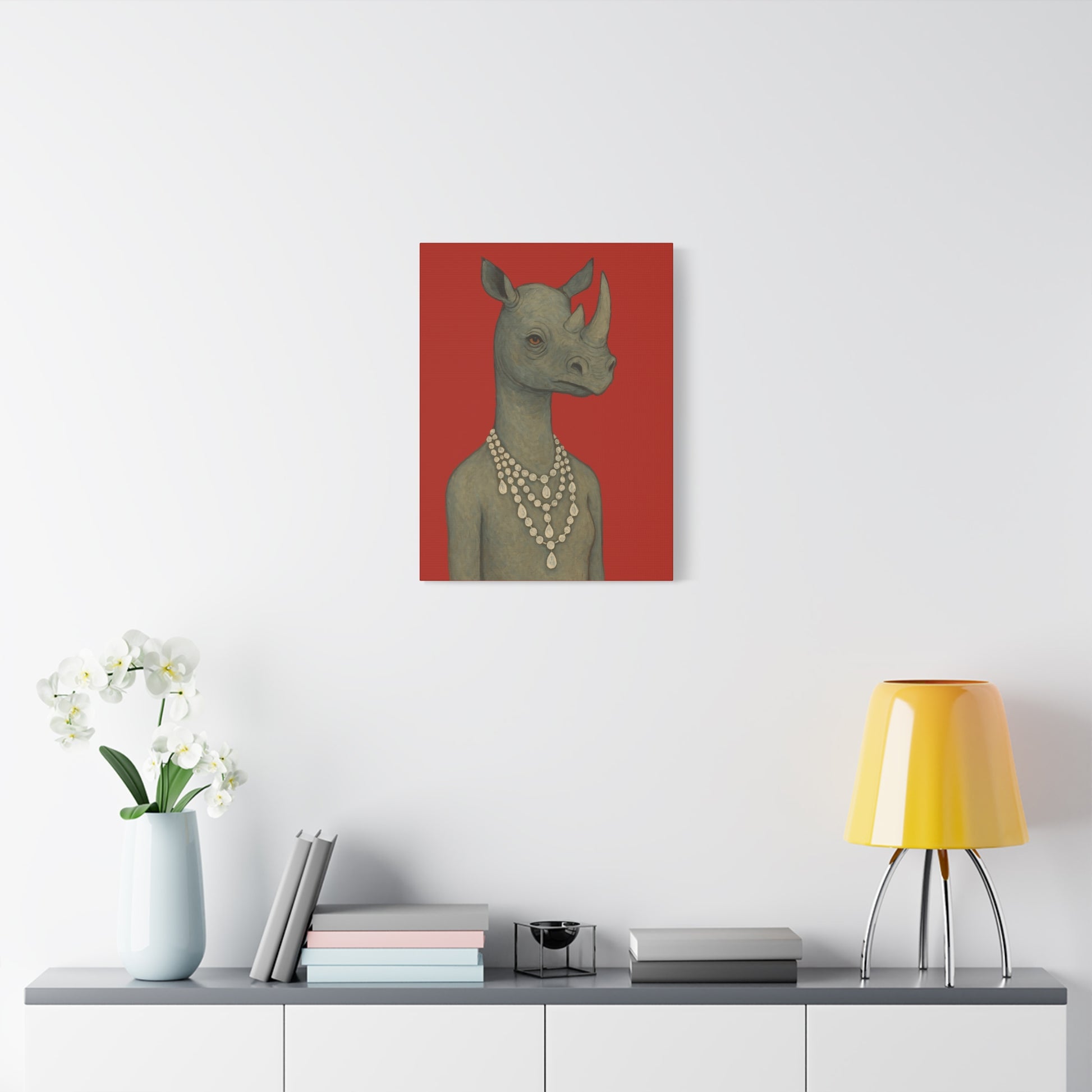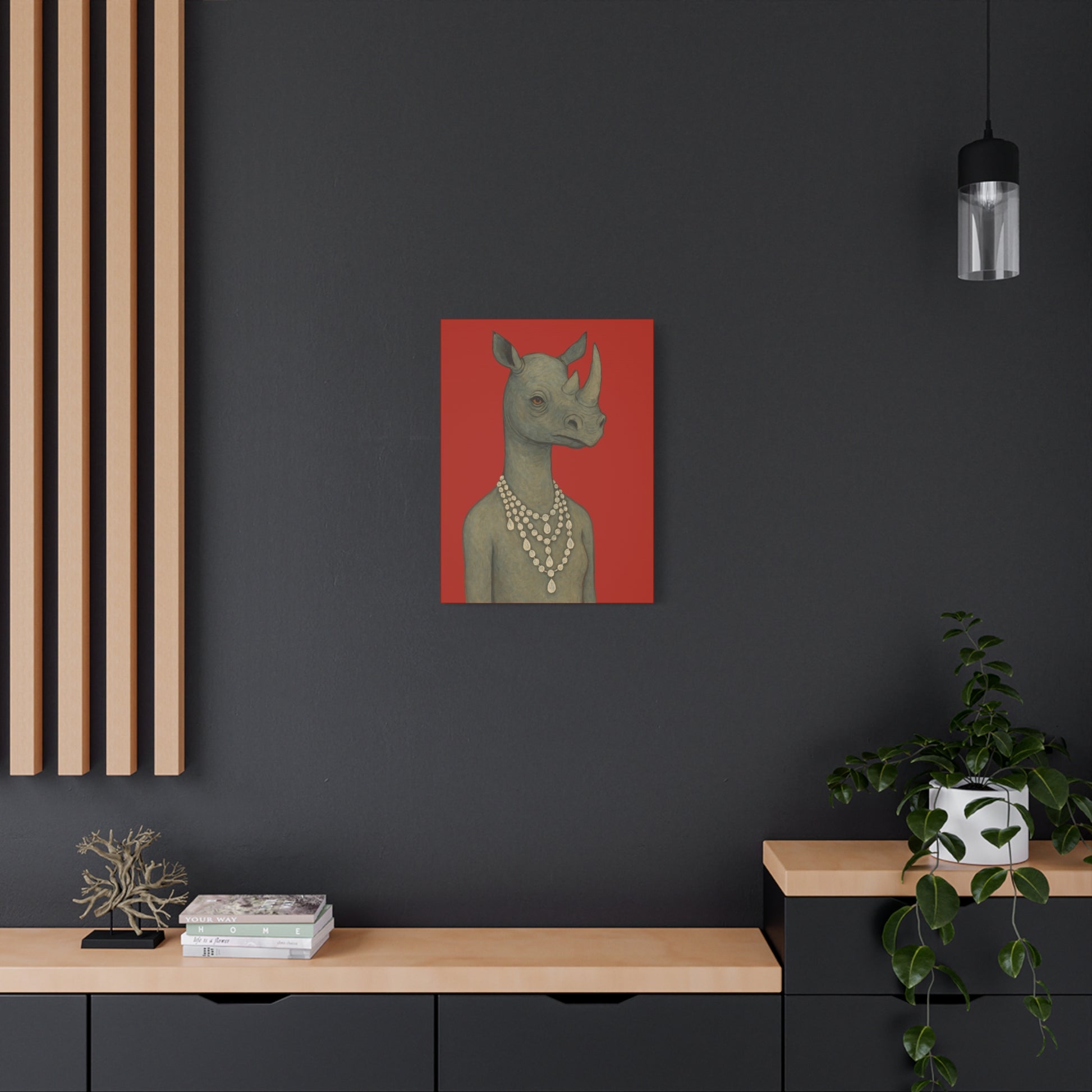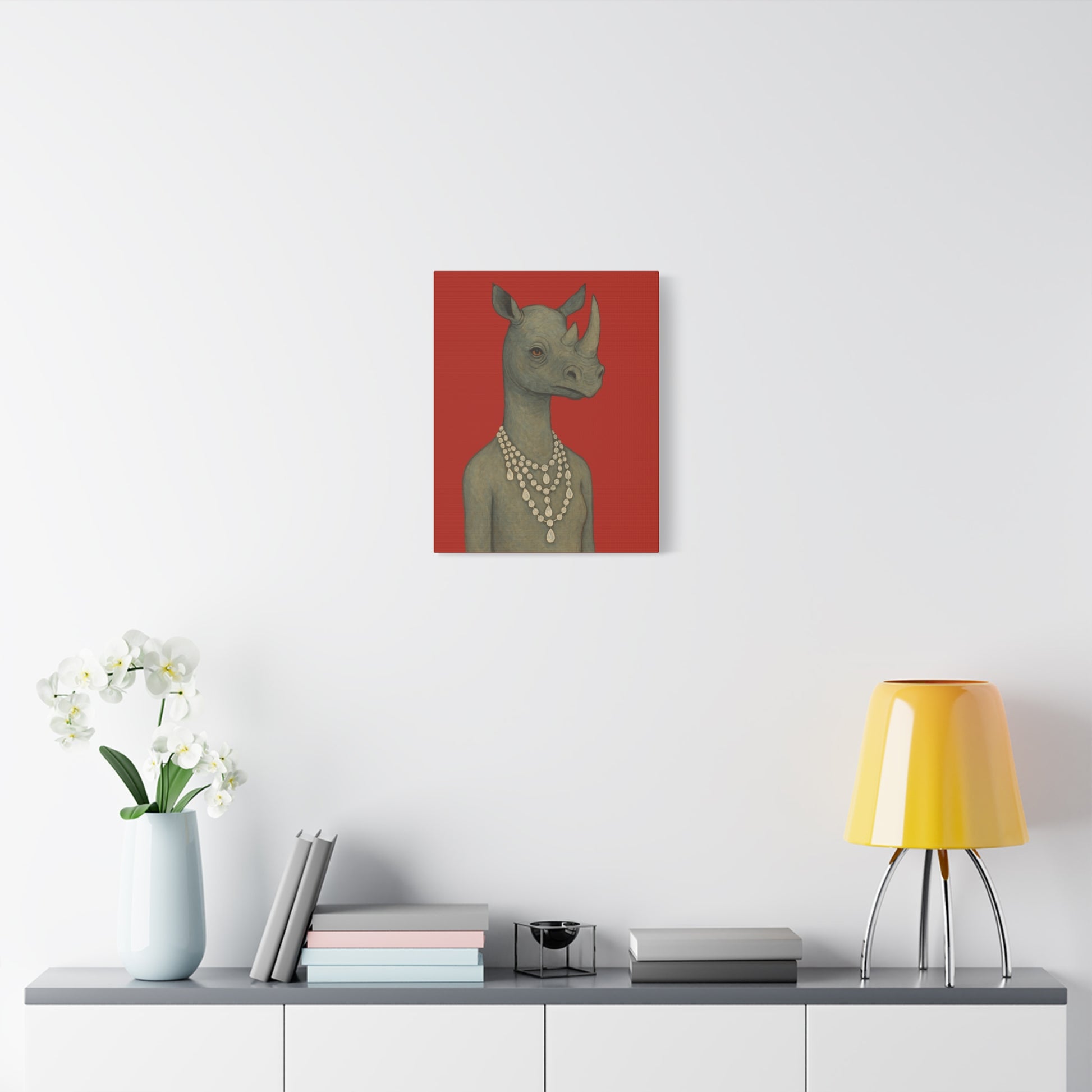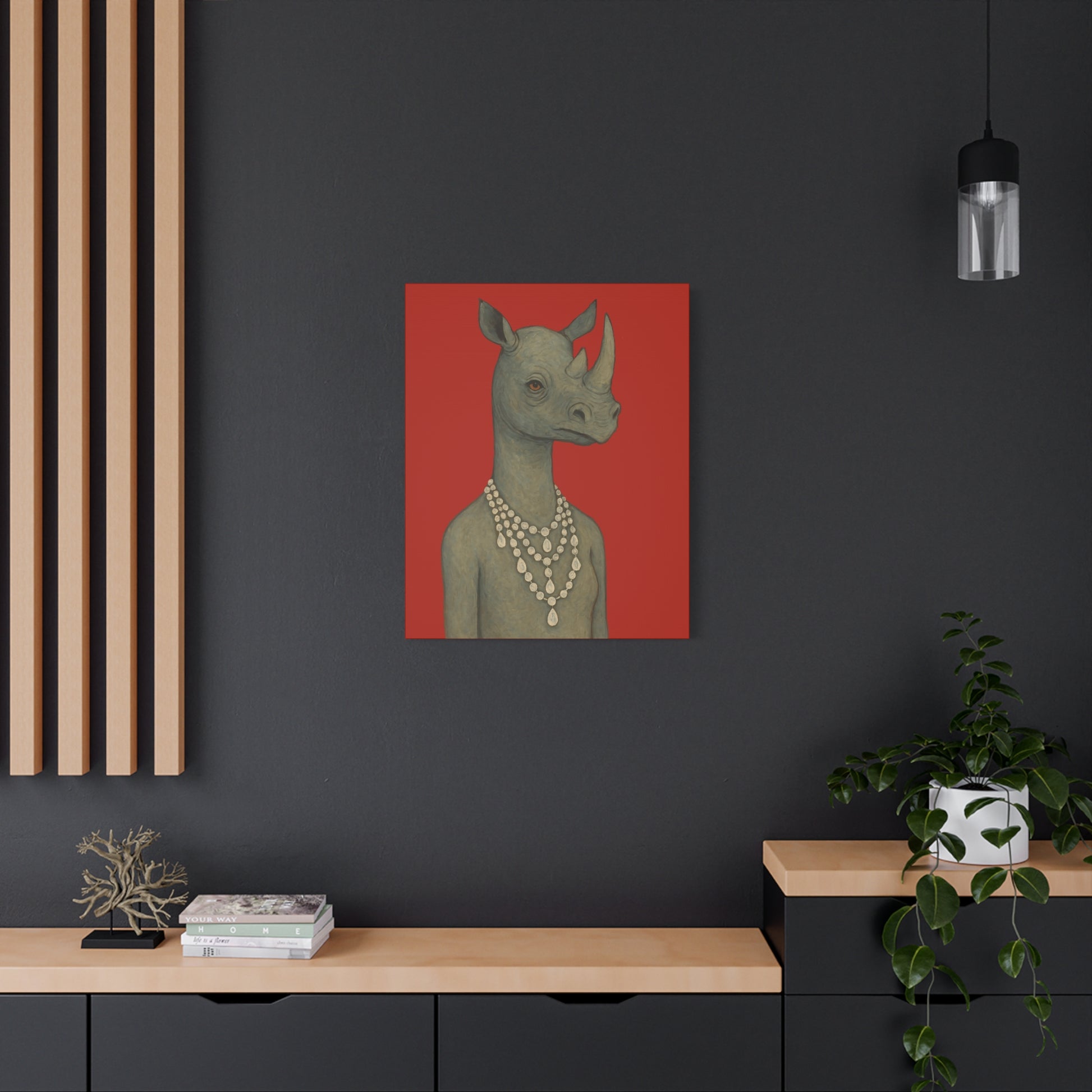Against a striking crimson backdrop, a robust rhinoceros commands attention. Its strong, armored neck bears a glittering array of diamonds, creating subtle light effects contrasting sharply with the animal’s powerful resilience. Its steady gaze, calm and profound, conveys quiet contemplation of its adorned state. This contrast of wild durability and precious adornment probes ideas of strength, value, and human interference.