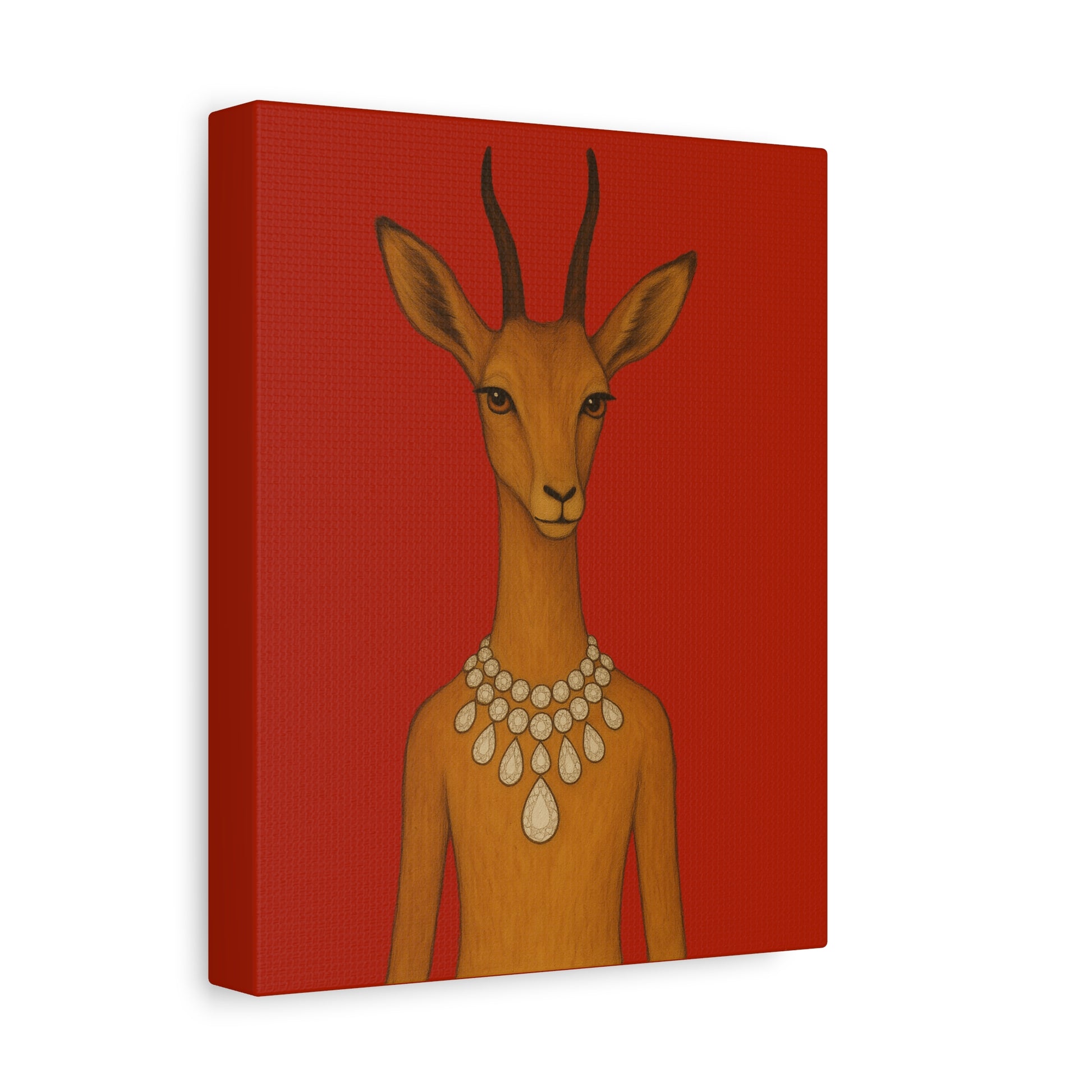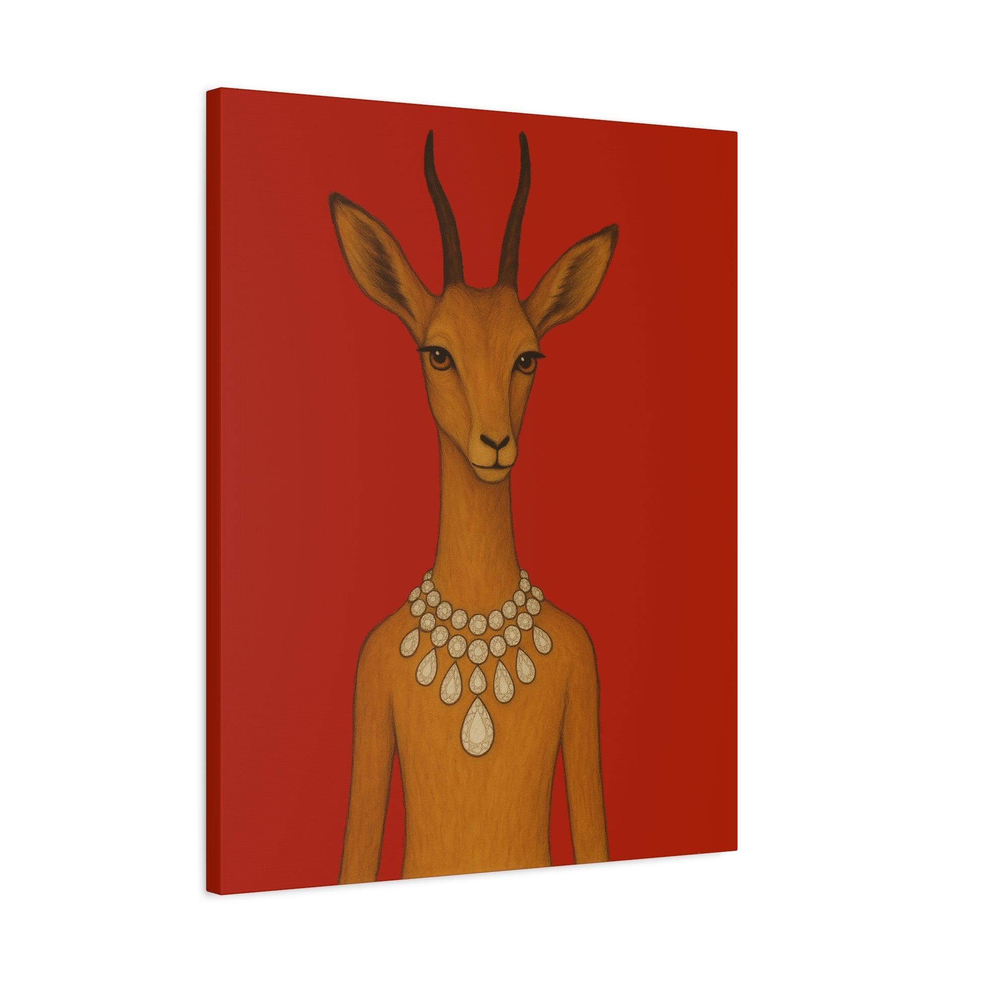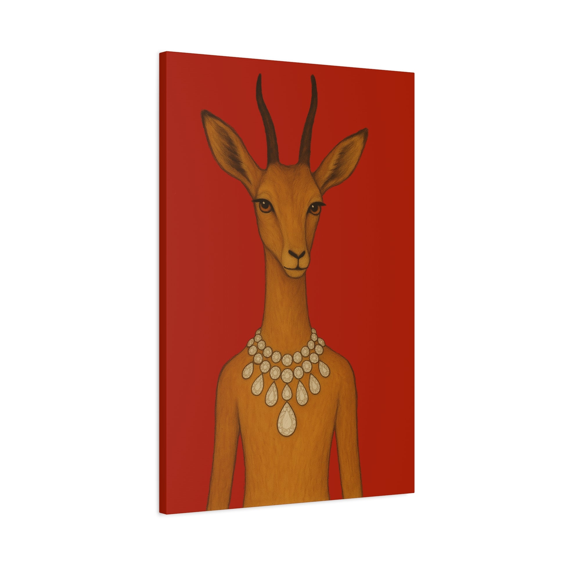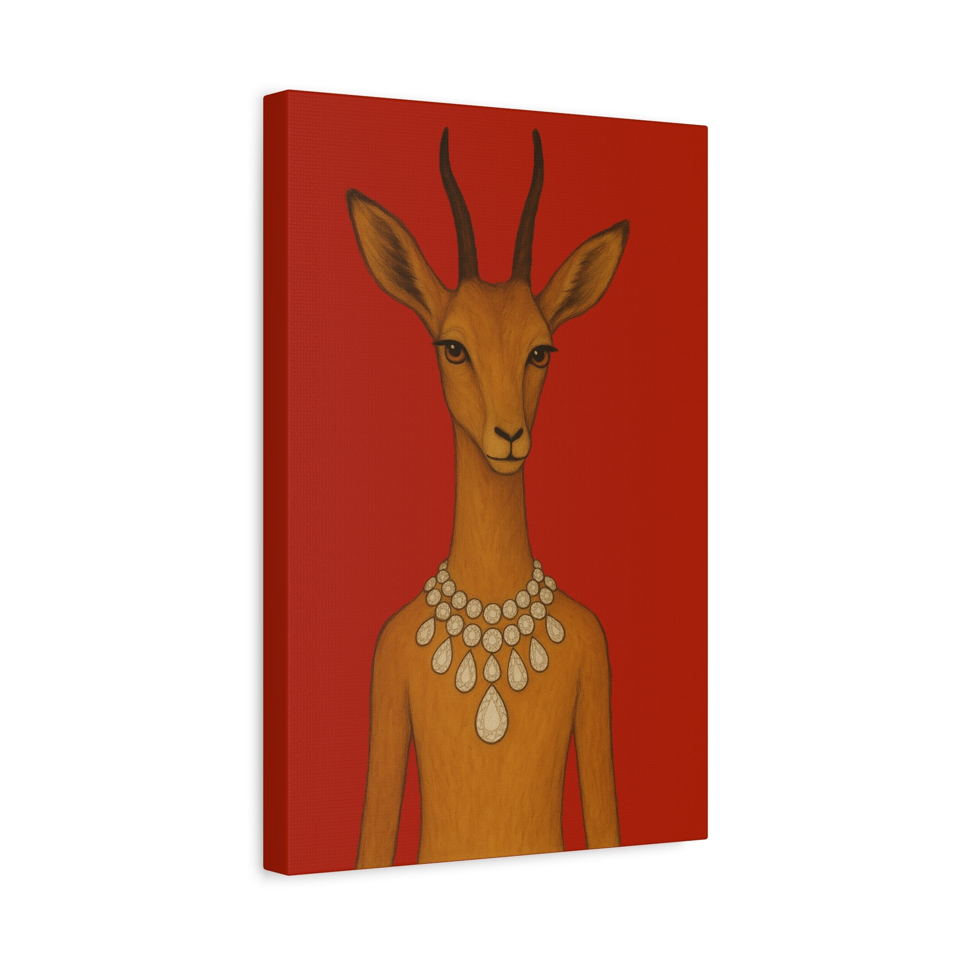 Poised elegantly against crimson, a gazelle’s slender neck bears sparkling diamonds. Its gentle gaze explores dignity, grace, and subtle irony in adornment.