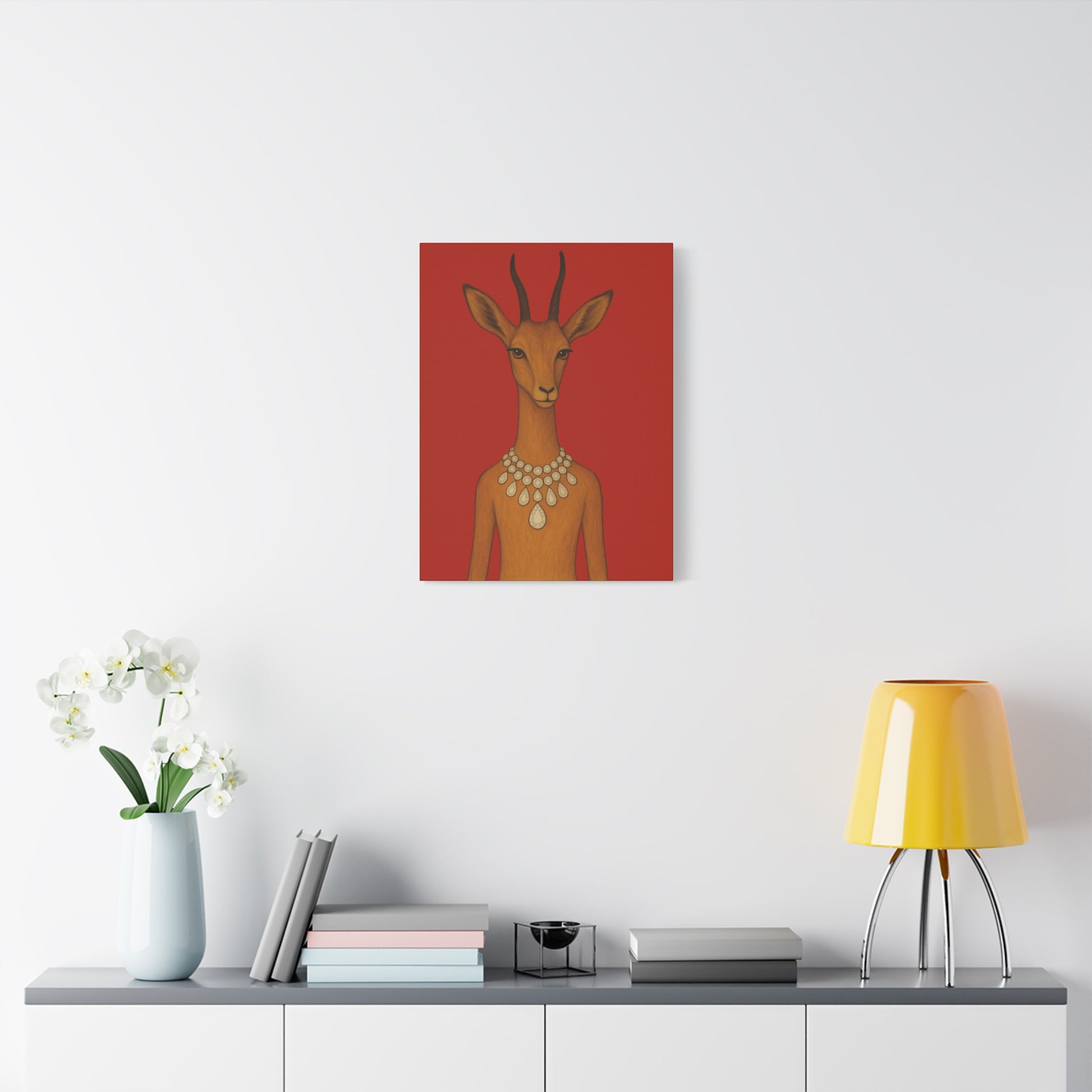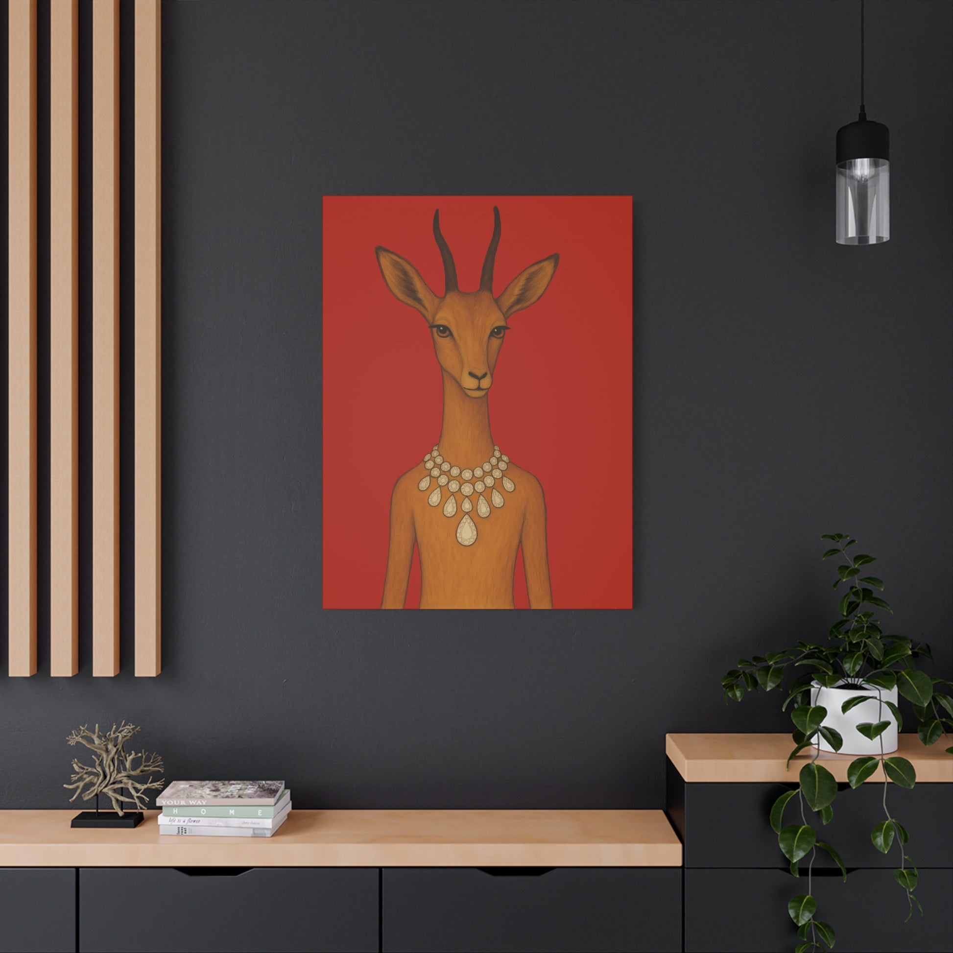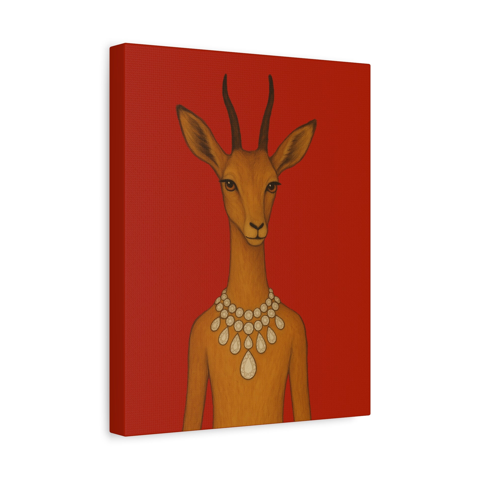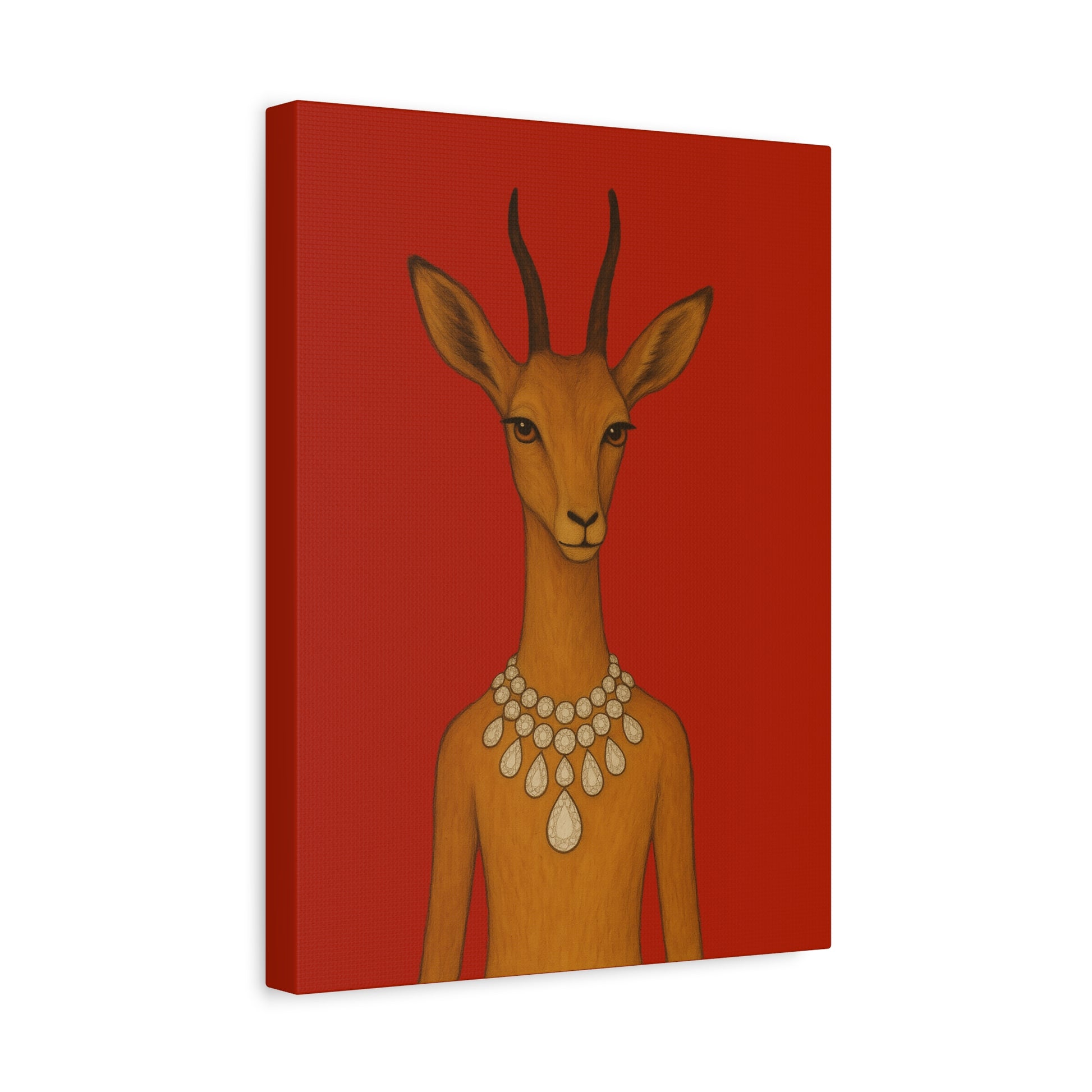 Poised elegantly against crimson, a gazelle’s slender neck bears sparkling diamonds. Its gentle gaze explores dignity, grace, and subtle irony in adornment.